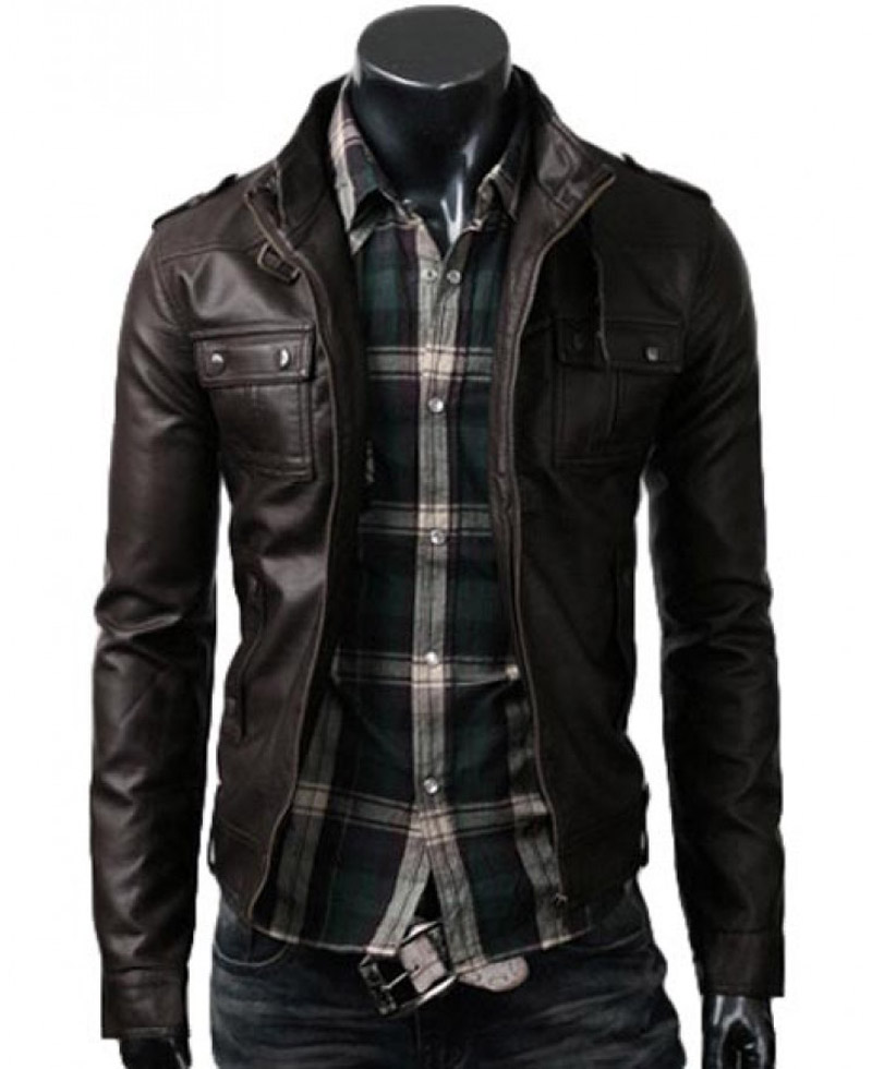 Men’s Strap Collar Slim Fit Dark Brown Leather Jacket