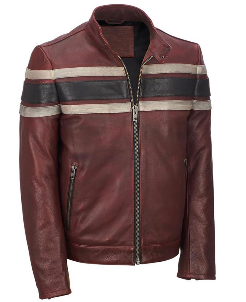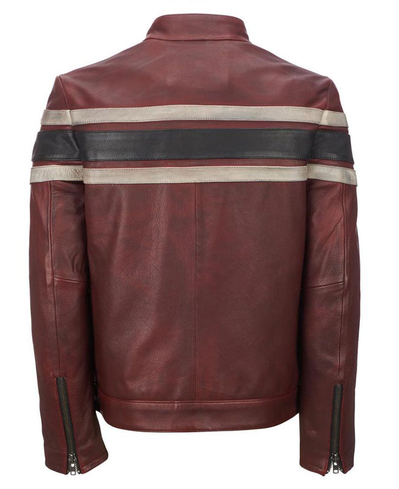 Men’s Retro Cafe Racer Striped Red Waxed Leather Jacket
