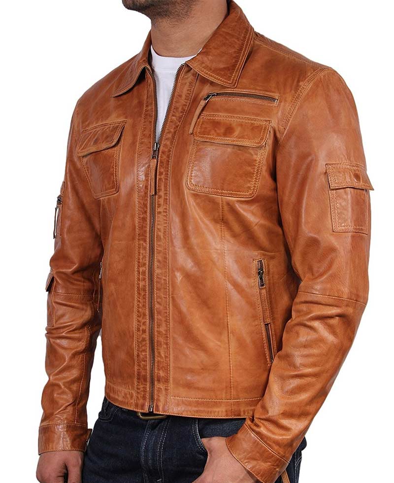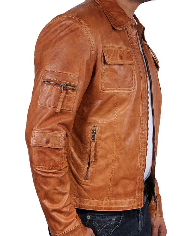 Tan brown leather jacket has been fabricated by genuine leather with viscose lining in tan brown color. The jacket has shirt style collar with front zipper closing. There are many pockets in this outfit which gives it bravo look. Two flap pockets on chest, two pockets at waist side and three pockets on sleeves. The sleeves are long also has zipper cuffs and small flap pocket on left sleeve which give a sophisticated look. Quality stitching makes men tan brown leather jacket perfect look.