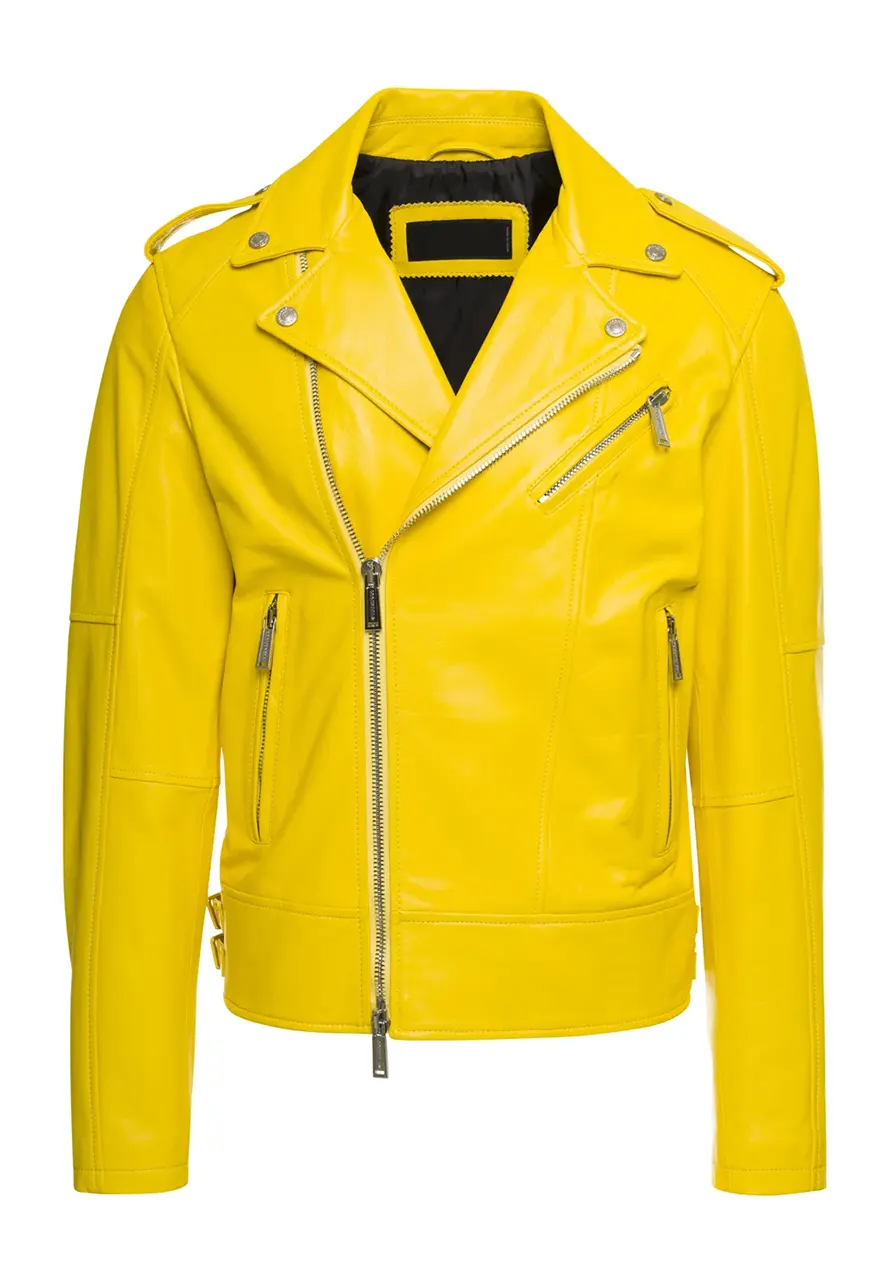 With a structured fit and front zipper, and classic biker placement, this yellow leather biker jacket mens will be a classic motorcycle jacket with a modern color turn.
