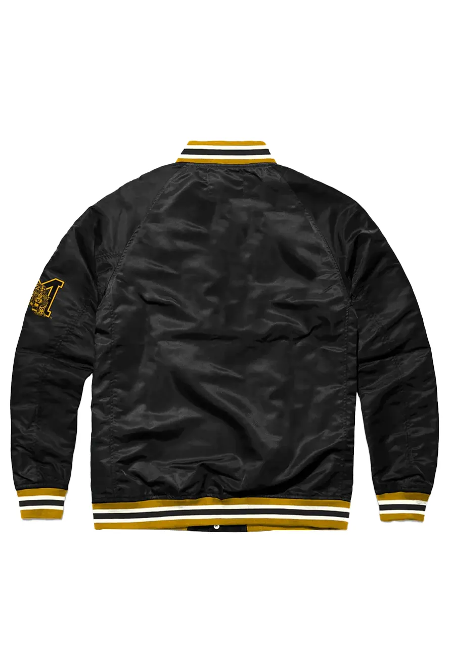 The Mizzou Black Letterman Jacket Will Wrap You With Its Timeless Coolness, Confident Attitude, and Add a Classy Charm to Your Personality. The Mizzou Varsity Jacket Has Been Fabricated in Premium-quality Satin to Make It Wearable in All Seasons, While Its Soft Viscose Inner Makes It Comfortable and Sweat-free. The Shiny Black Color of the Jacket Will Enhance Your Smartness. The Mizzou Black Letterman Varsity Jacket Has Been Designed by Using Remarkable Features Like a Rib-knitted Stand-up Collar, Snap Tab Buttoned Closure, Rib-knitted Cuffs and Hemline, and Side Waist Pockets to Make It More Functional. The Mizzou Letterman Jacket Will Let You Embrace the Spirit of Adventure.