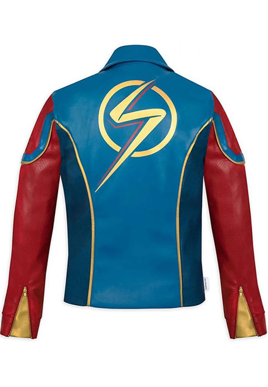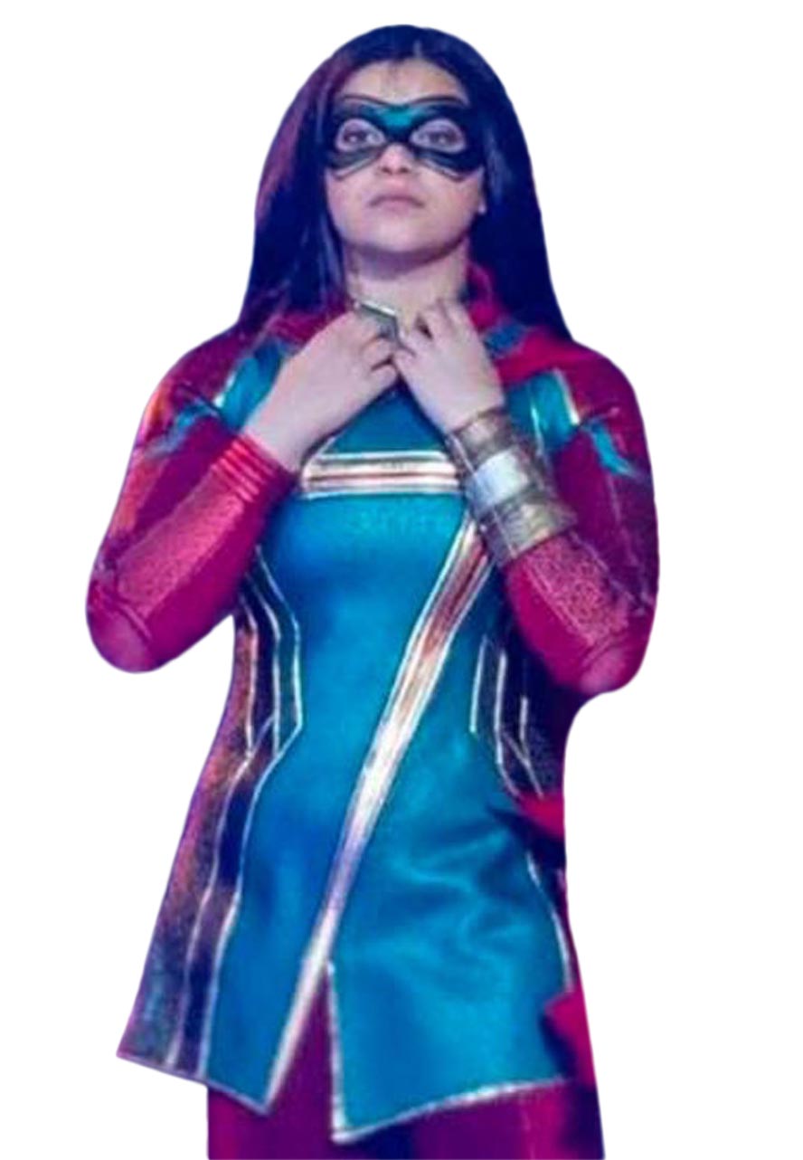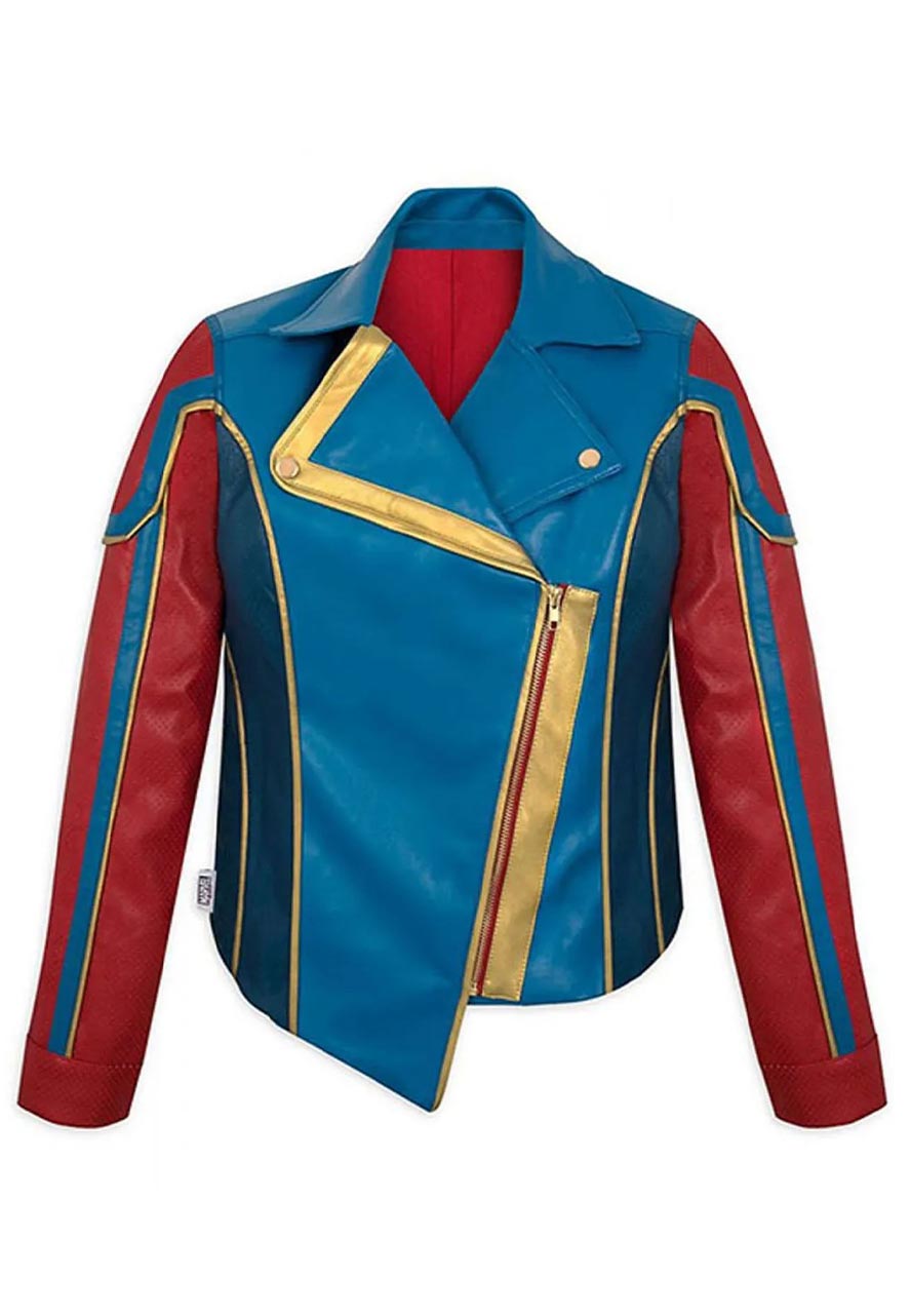 Now You Can Also Look Bold and Sturdy and Cast a Magical Spell on All Around You Through Your Confidence and Style Just You Need to Shop and Wear the Ms. Marvel Jacket to Wrap Yourself in a Cacoon of Fashion. Crafted From the Finest Faux Leather, This Jacket Blends Comfort and Confidence Seamlessly. Its Luxurious Viscose Inner Lining Promises Both Coziness and Excellent Moisture Management, Delivering a Delightful Wearing Experience. The Blue and Red Colors Combination Will Captivate All Eyes. The Ms Marvel Jacket Exemplifies Meticulous Design, Featuring a Lapel-style Collar and zippered Closure, and Its Fit and Slim Feature Will Stand You Apart. The Kamala Khan Jacket is the Smart Costume to Wear This Halloween.