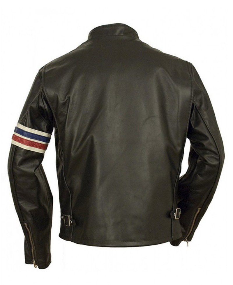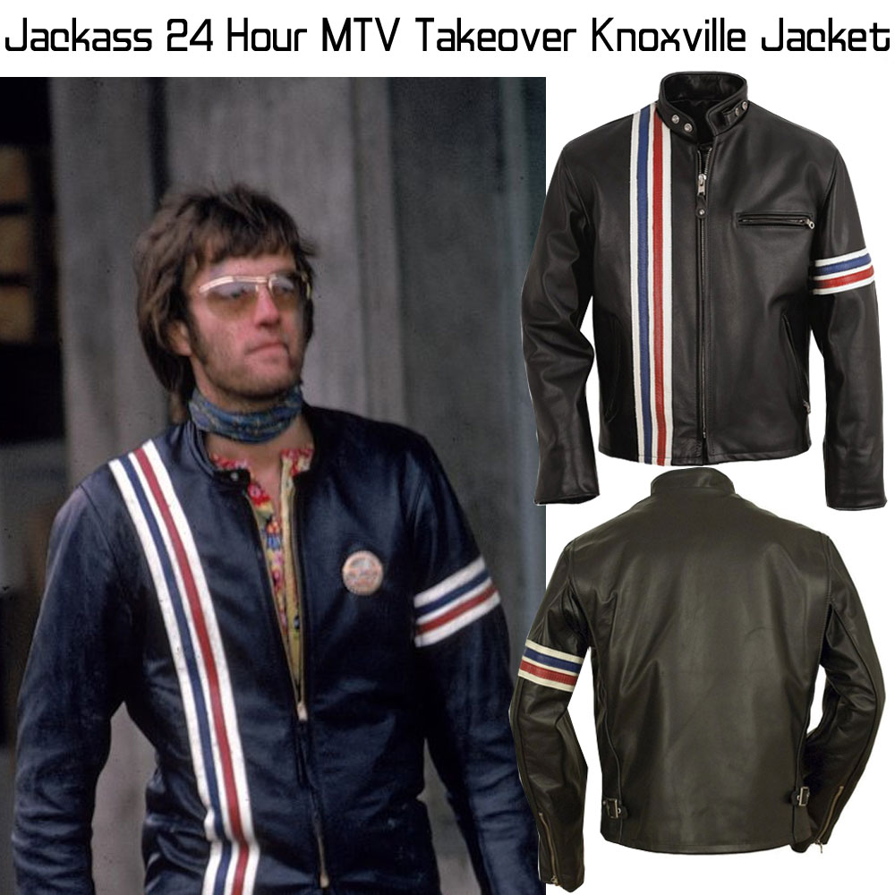 Johnny Knoxville Jacket is prepared from genuine leather or faux leather. Inside of leather you will feel comforts viscose lining. Black charming color has given it unforgettable beauty. One horizontal zipper pocket is present at the left chest of attire. Two more side waist zipper pockets are added too. Johnny Knoxville Leather Jacket has snap tab collar style. Front closure is given through best zip. Red, blue and white stripes are given on right front. Same stripes are present on left arm. Straps with buckle are added on both sides waist. Long sleeves are fitting in appearance. Zipper cuffs are looking slimmer. For bikers, it is a perfect selection.