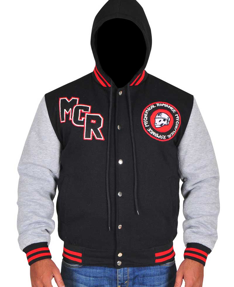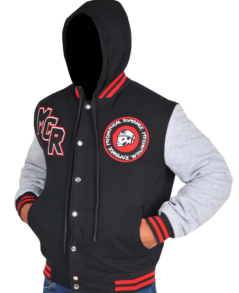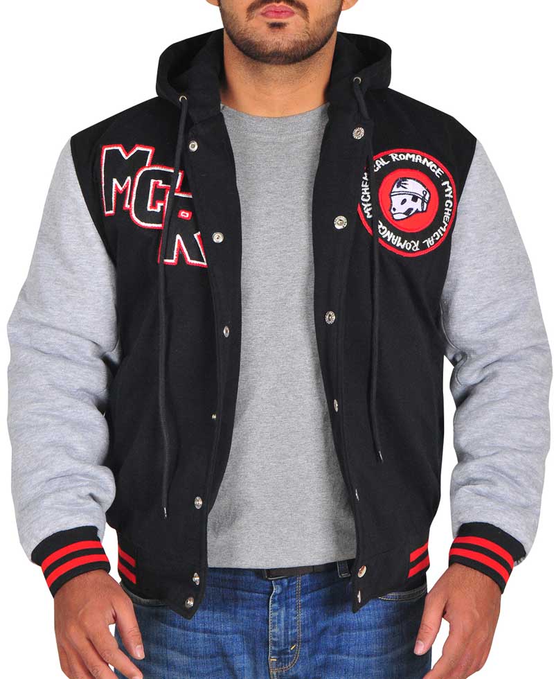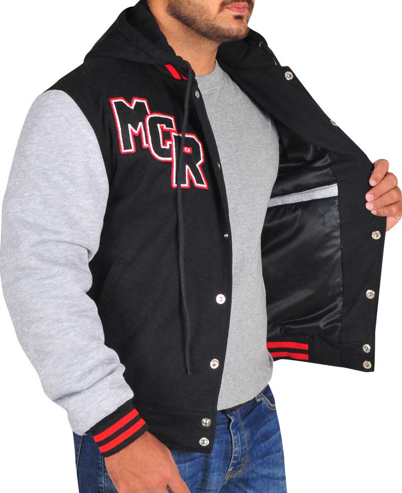 My chemical romance letterman hoodie is made from high quality fleece material and is very comfortable in wearing because of the inner soft viscose lining.My chemical romance varsity jacket has rib knitted round neck collar along with a hoodie that looks really decent. It has rib knitted cuffs on full length sleeves.The my chemical romance bomber hoodie has a front button closure. It has pockets on the waist and on the inner sides. On its chest it has mcr and my chemical romance logos attached.