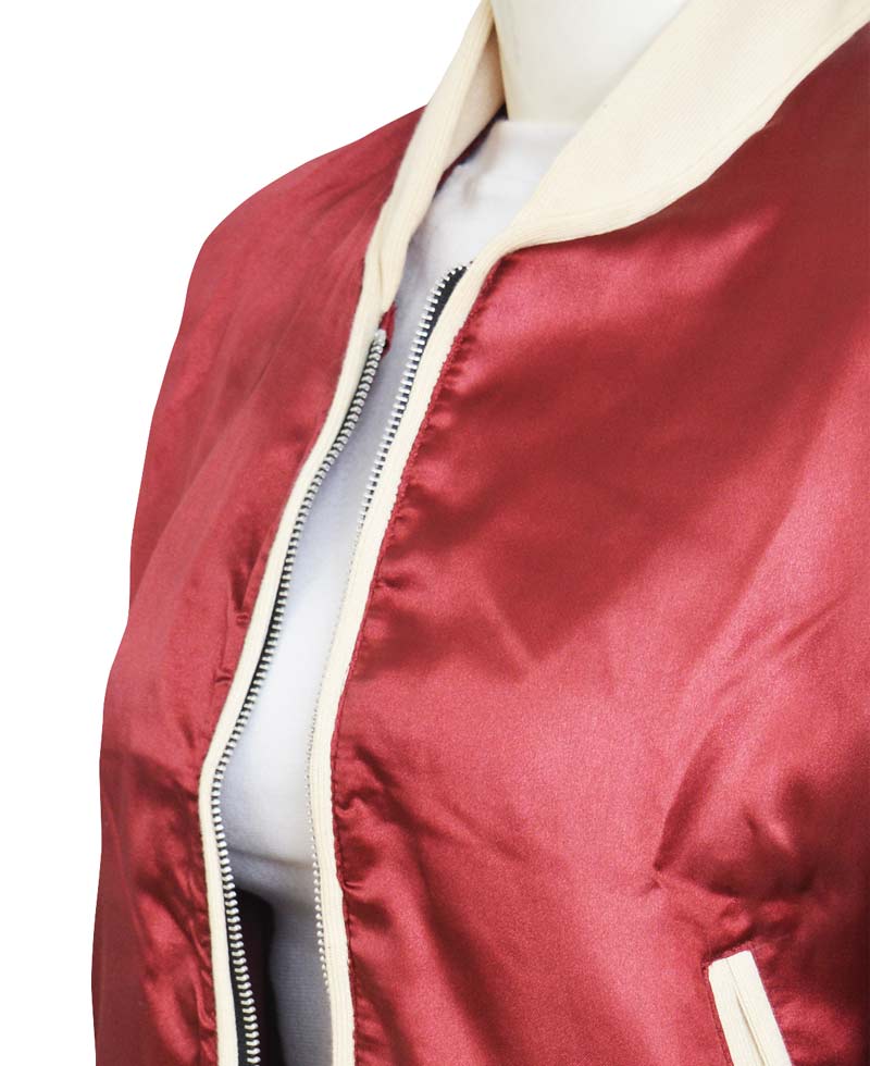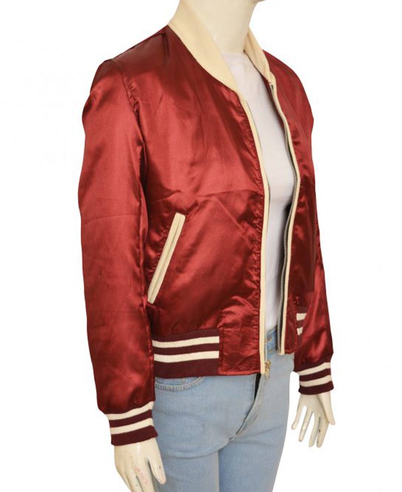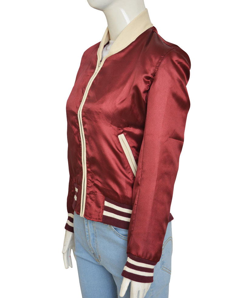 The nerve bomber jacket is made from high quality satin material and is very comfortable to wear because of the inner soft viscose lining. This garb will keep you warm in cold climates. The Emma Roberts nerve jacket has a maroon color and pockets inside and outside for you to keep your stuff in them. The vee jacket has a round neck collar. It has rib knitted and hem cuffs on full length sleeves. It has a rib knitted waist line and a front zipper closure.