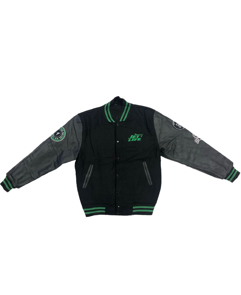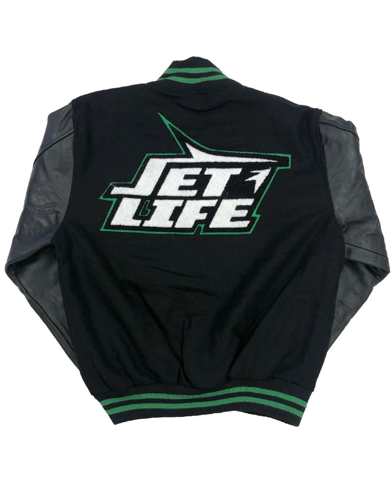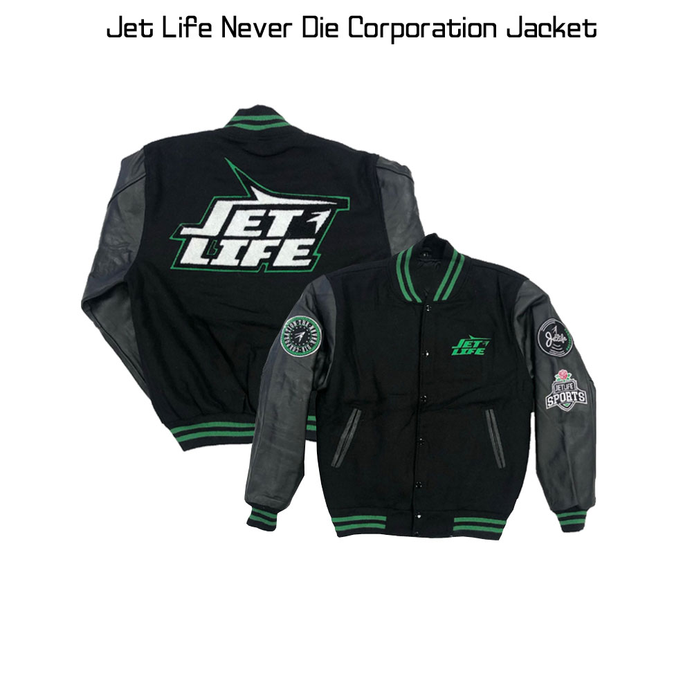 Jet life varsity jacket has a very attractive appearance. The external side of this jacket is fabricated by using high-quality wool fabric. Top-quality genuine leather material is used for the manufacturing of the sleeves. The internal side of this Jet life varsity jacket is stitched with smooth and soft viscose lining that will keep you warm and comfortable all the time. The jacket has buttons attached to its front side for closure. Jet life varsity jacket has an erect style collar. The jacket comes with two front waist pockets where you can secure stuff. There is a Jet Life logo on the chest and on the back along with patches of jet life sports on the sleeves. The never die corporation jacket has a rib knitted hemline. The jacket comes with rib knitted style cuffs on long-length leather sleeves.
