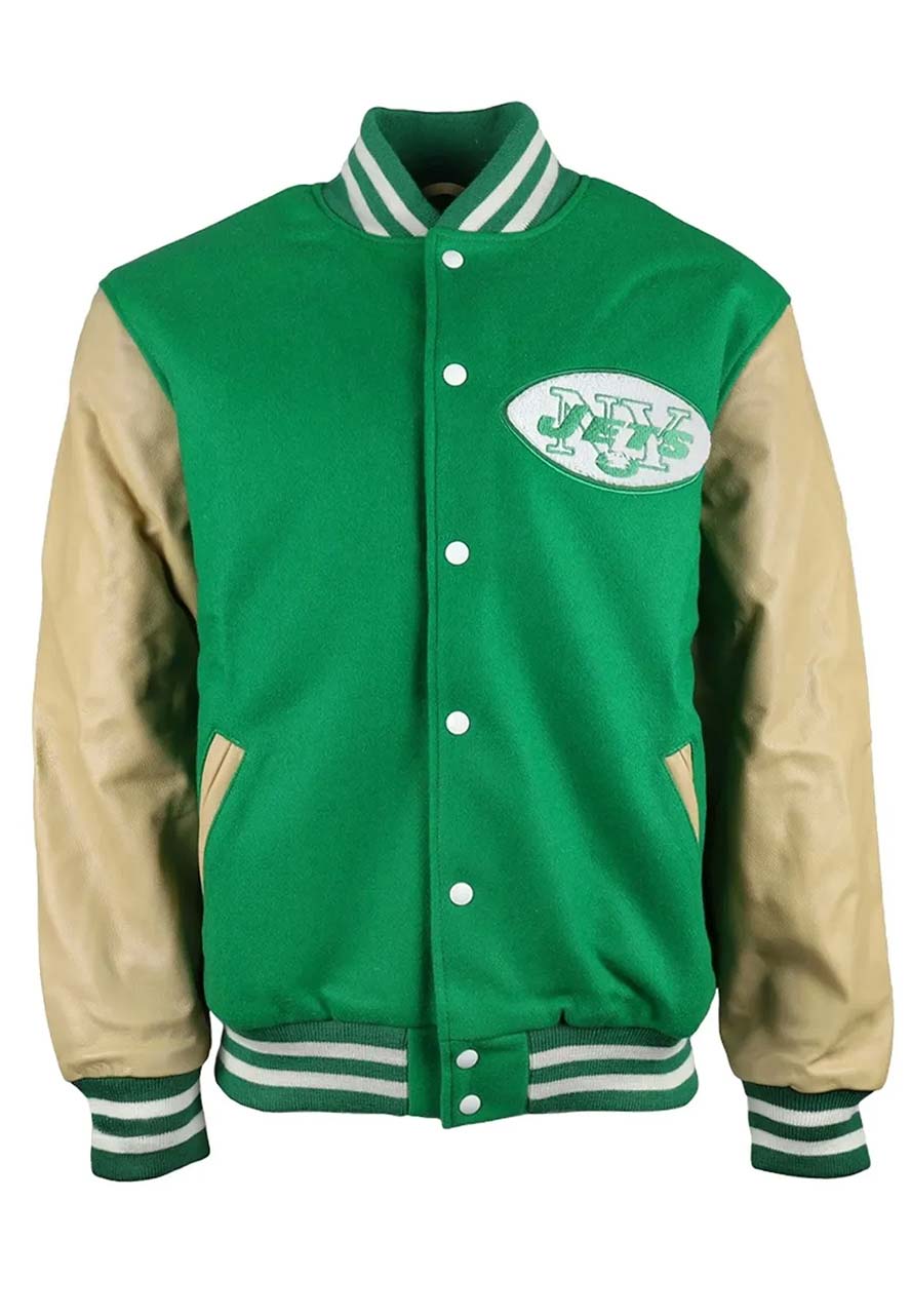 Experience the Class of Comfort and Sophistication in the Finely Woven New York Jets Varsity Green Jacket, Designed to Elevate Your Winter Wardrobe With Its Luxurious Looks and Fashion-forward Detailing. The Dapper Jacket Has Been Fabricated by Premium-quality Wool and Leather to Make It Warm and Ageless, While Its Soft Viscose Inner Makes It Comfortable and Sweat-free. The Charming Green Color Will Increase the Charm of Your Personality. The New York Jets Varsity Jacket Has Been Designed by Using All Smart Features Like a Rib-knitted Stand-up Collar, Snap Tab Buttoned Closure, Rib-knitted Cuffs and Hemline, and Side Waist Pockets to Keep Your Small Accessories. The Jets Letterman Jacket Has Superior Craftsmanship and a Versatile Look That Will Give You a New Way of Wearing Jackets.