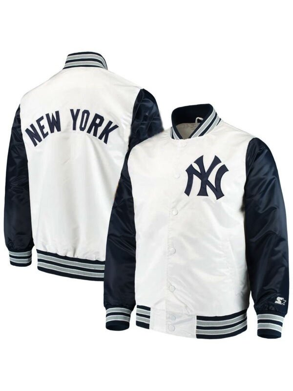This season wear something that will wrap you with an outfit that will not only keep you comfortable but also leave you with a cool and smart personality. The dynamic jacket has been fabricated by premium quality satin and lined with soft viscose inner to make it ageless and comfortable. The charming combination of black and white colors will give you new looks. The Yankees starter white baseball bomber jacket has been tailored by using attributes like a rib-knitted stand-up collar, snap tab buttoned closure, rib-knitted cuffs and hemline, and side waist pockets. Now bring more confidence and more attraction into your personality by wearing the Yankees starter white baseball bomber jacket.