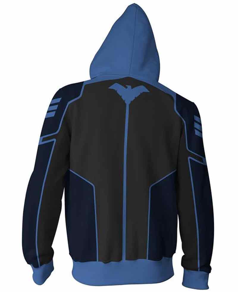 nightwing hoodie is fabricated from high quality fleece fabric. This jacket will keep you protected from cold weather and will make you feel warm and cozy. The inner side soft viscose lining makes this garb very comfortable to wear that you can wear it all day long. Selecting a perfect apparel to wear is a tough task therefore we bring you this jacket which you can wear casually or for a party wear. nightwing hoodie has full length sleeves on rib knitted cuffs along with a rib knitted waist hemline. This hoodie has front ykk branded zipper style closure that fits in perfectly with the style of this attire. This apparel has an attached hoodie. There are two pockets at waist in which you can rest your hands or can secure some stuff. You can get this apparel in a black and blue color. Order right now before we run out of stock.