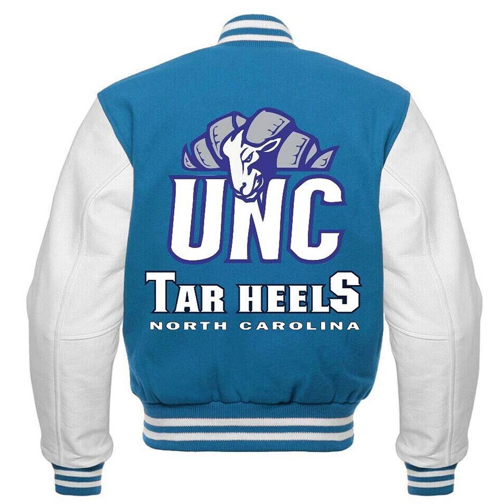 The North Carolina Tar Heels Unc Jacket Looks Sleek And Stylish And It Will Also Exude Your Love And Devotion For Your Favorite Team And Your Style At The Point. Its Premium Quality Wool Fabrication Makes It Warm And Ageless. Its Soft Viscose Inner Makes It Comfortable And Sweat-free. Its Impressive Combination Of White And Baby Blue Colors Makes It Worth Wearing. The North Carolina Tar Heels Unc Varsity Jacket Has Been Tailored In A Very Modish Way By Using Attributes Like A Rib-knitted Stand-up Collar, Snap Tab Buttoned Closure, Rib-knitted Cuffs, And Hemline And Side Waist Pockets. The Unc Varsity Jacket Has Top-notch Quality, And It Also Shows Your Good Taste In Fashion.