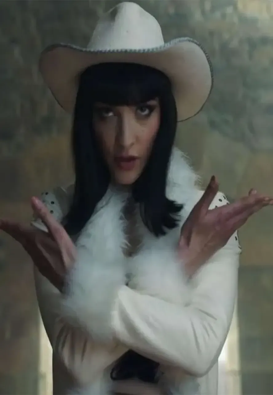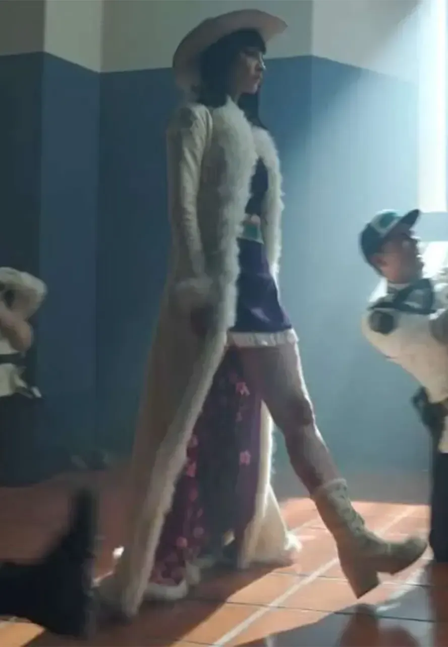 This Miss All Sunday white leather coat has an elegant design with a sleek and sophisticated look that portrays the appearance of this character. A sleek and shiny white finish, combined with the long silhouette, makes the appearance bold and elegant, like the Miss All Sunday coat that appears in the series.