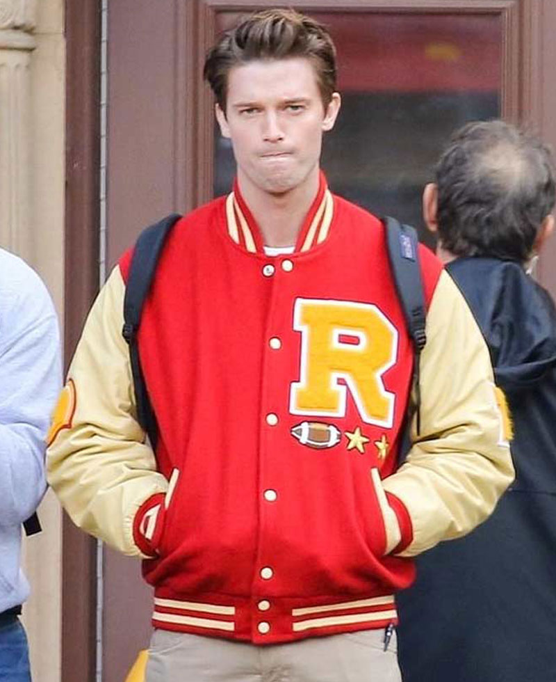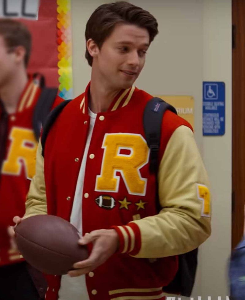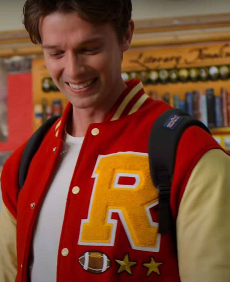The idea of this varsity jacket is taken from the famous American teen Netflix movie called Moxie where the actor Patrick Schwarzenegger wore this jacket when he was portraying the character of Mitchell Wilson. The external side of this jacket is fabricated with top quality wool fabric along with high-quality genuine leather material for the sleeves. The appealing red and off-white color looks so desirable on this varsity jacket. Patrick Schwarzenegger Moxie jacket comes with its internal area stitched with smooth and soft viscose lining. The jacket has buttons attached to its front side for closure. Patrick Schwarzenegger Moxie jacket will give you warmth and comfort. There are rib knitted style cuffs on full length style leather sleeves of this varsity jacket. Mitchell letterman jacket comes with a rib knitted style collar. This jacket has two front waist pockets too where you can keep stuff. The rib-knitted hemline gives this varsity jacket a fitted look.