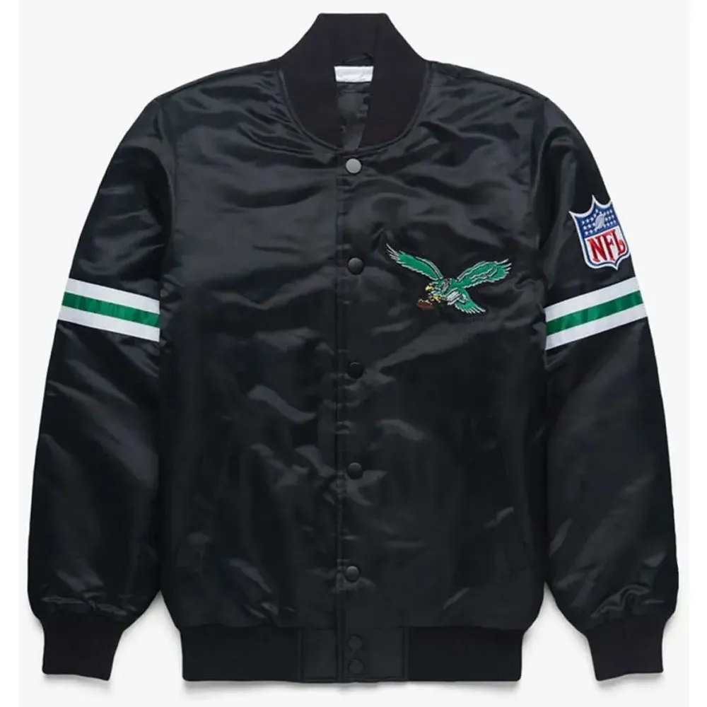 The Philadelphia Eagles Striped Jacket is made up of high-quality satin. The jacket is available in majestic green, black, and white colors, which gives it an innovative and enchanting look. The Philadelphia Eagles satin jacket features a rib-knit collar. The striped satin jacket features a snap-button front closure. A soft inner viscose lining of the jacket keeps you warm and relaxed. The sleeves of the Satin jacket are long with rib-knit cuffs. The satin eagles jacket has two inner and two side pockets. The fine quality stitching jacket and desirable to wear. The Eagles satin jacket is an ideal choice to wear to parties.