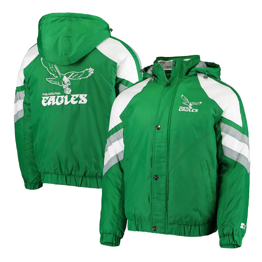 The vibrant Kelly green color captures the true spirit of the Eagles’ iconic jersey, making it instantly recognizable to any fan. It features a secure full-zip front closure with an added snap-tab at the base, offering both style and functionality. The hood with adjustable drawstrings adds extra warmth and protection during cold or windy days.