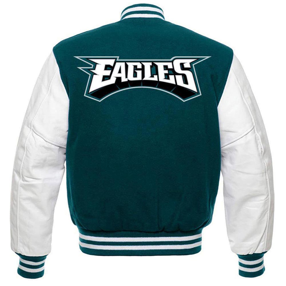 The Philadelphia Eagles Varsity Nfl Jacket is the Standout Piece, It Will Not Only Put Confidence but Also an Extra Charm to Your Overall Looks. Its Premium Quality Wool Fabrication Makes It Warm and Ageless Furthermore Its Soft Viscose Inner Makes It Comfortable and Sweat-free. The combination of White and Green Colors Will Give You a Dynamic Personality. The Philadelphia Eagles Jacket Has Been Featured Using Impressive Attributes Like a Rib-knitted Stand-up Collar, Snap Tab Buttoned Closure, Rib-knitted Cuffs, and Hemline and Side Waist Pockets. The Philadelphia Eagles Varsity Jacket is the Epitome of Style and Fashion.
