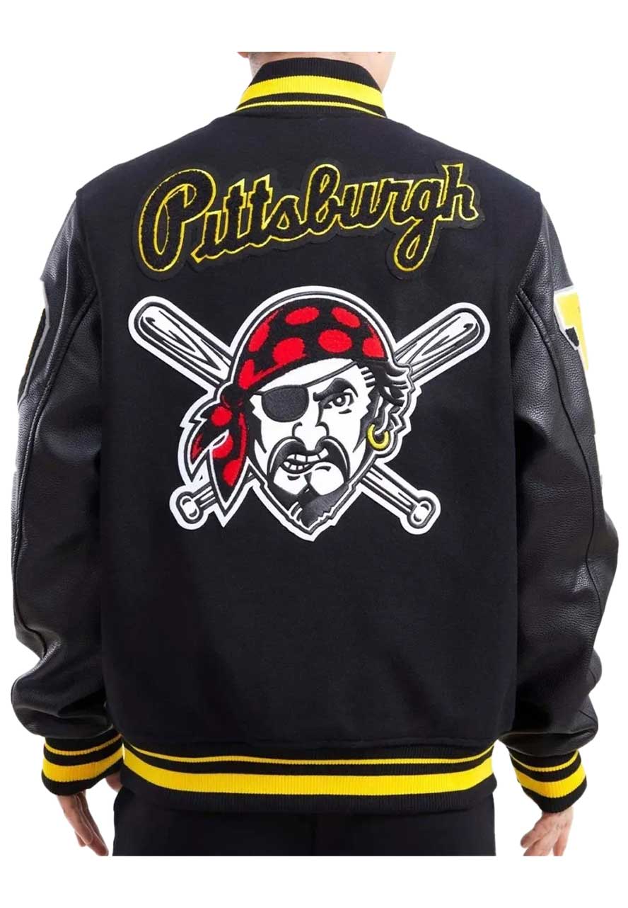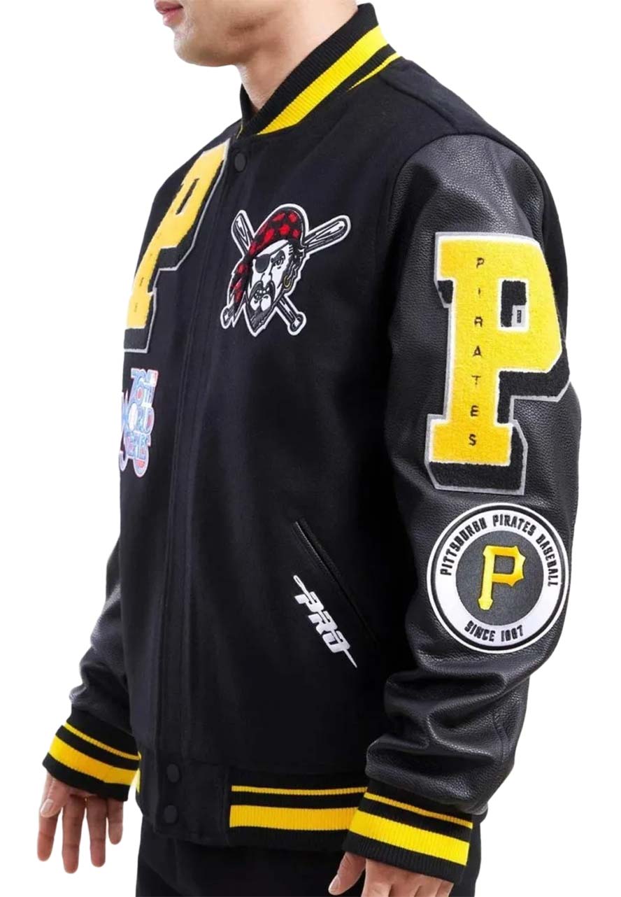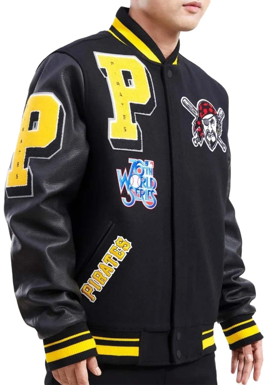 The Pittsburgh Pirates Logo Varsity Jacket Will Suit Your Taste for Fashion, It is Both Trendy and Timeless. This Jacket Will Will Enrich Your Personality With Charm and Stand Out From the Crowd. This Jacket Has Been Fabricated by Premium-quality Wool to Make It Warm and Ageless, While Its Soft Viscose Inner Will comfort you All-day Long. The Stong Black Color Will Look Stunning on You With Tighter Jeans. The Pittsburgh Pirates Varsity Jacket Has Been Designed by Using All Smart Features Like a Rib-knitted Stand-up Collar, Snap Tab Buttoned Closure, Rib-knitted Cuffs and Hemline, and Side Waist Pockets to Increase Its Fashion and Functionality. The Pittsburgh Pirates Jacket Will Give You A Perfect Finishing Touch to Your Outfit.
