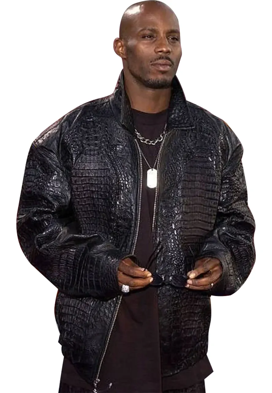 The Idea of This Stylish Leather Jacket is Taken From the Famous American Rapper Earl Simmons Famous for His Stage Name Dmx Who Wore This Apparel. The External Side of This Jacket is Manufactured With High-quality Faux Leather Material. The Dmx Leather Jacket Comes in Black Color. The External Side of This Jacket is Stitched With a Smooth and Soft Viscose Lining That Keeps You Warm and Comfortable All the Time. The Dmx Leather Jacket Has a Ykk Branded Zipper Attached to Its Front Side for the Closure. The Alligator Texture of This Black Leather Jacket Makes It More Desirable to Wear. Earl Simmons Leather Jacket Has a Shirt Style Collar. This Leather Jacket Has Buttoned Style Cuffs on Full Length Style Sleeves. There Are Two Front Waist Pockets on This Leather Jacket to Secure Stuff.
