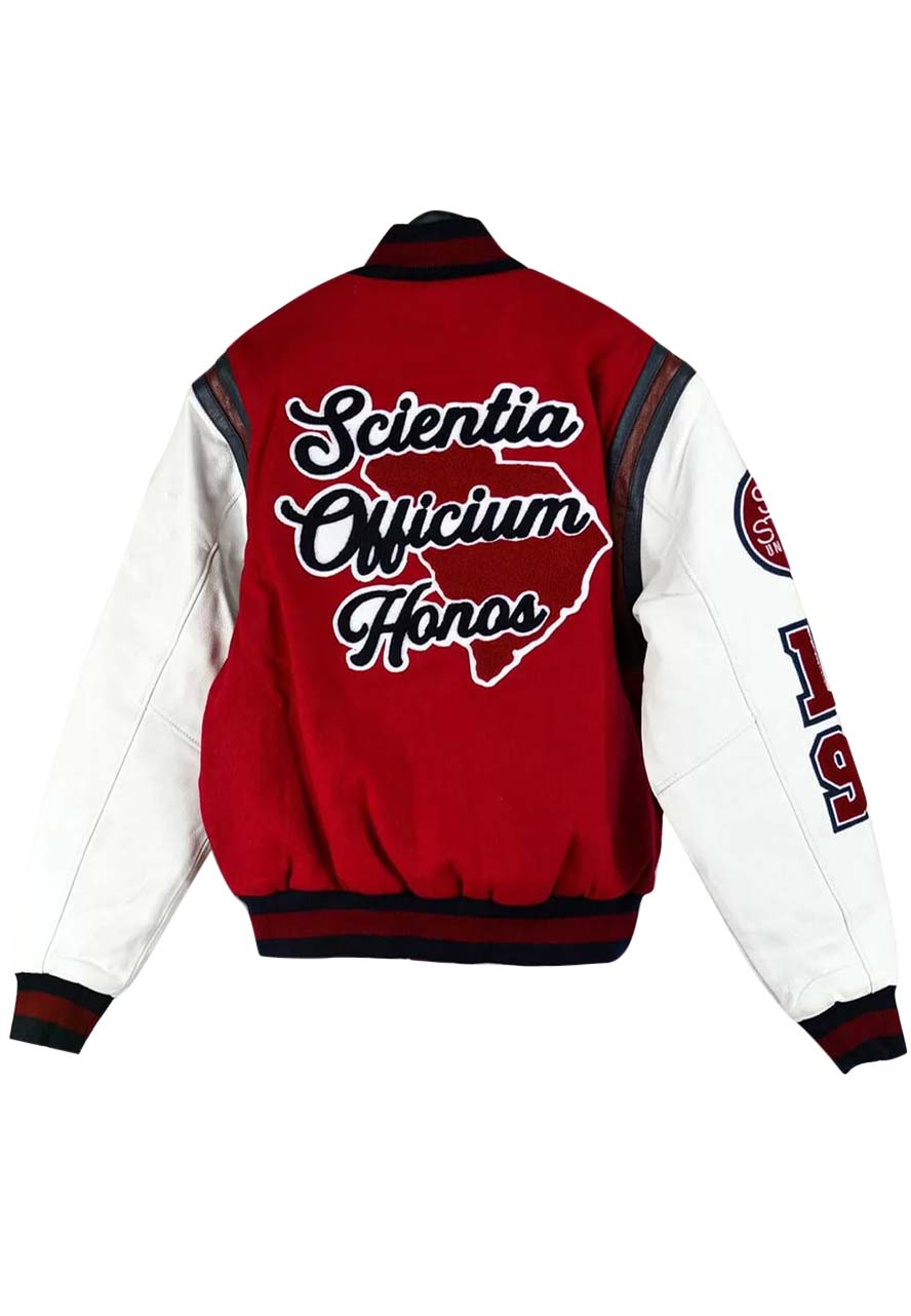The South Carolina Jacket Will Not Only Complement Your Complexion Perfectly but It Will Also Add a Layer of Sophistication to Your Dressing Style While Keeping You Warm and Cozy. The Dapper Jacket Is Fabricated by Premium-quality Wool to Make It Warm and Ageless, While Its Soft Viscose Inner Makes It Comfortable and Sweat-free. The combination of Red and White Color Will Enhance Your Smartness. The  South Carolina State University Varsity Jacket Has Been Designed by Using All Smart Features Like a Rib-knitted Stand-up Collar, Snap Tab Buttoned Closure, Rib-knitted Cuffs and Hemline, and Side Waist Pockets to Keep Your Small Accessories. The South Carolina Letterman Jacket Will Truly Set You Apart From the Crowd.