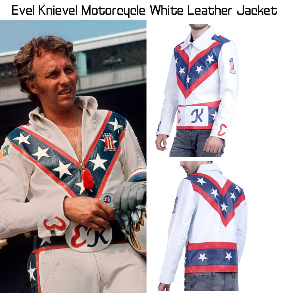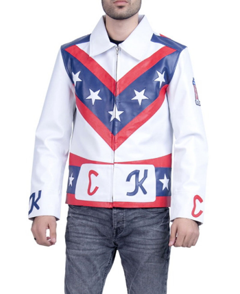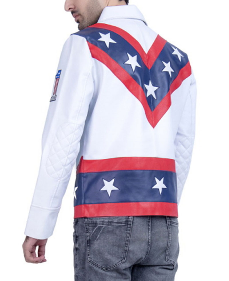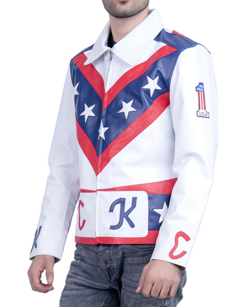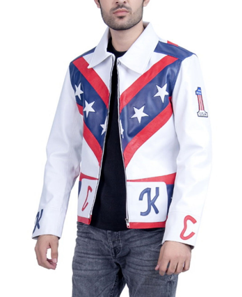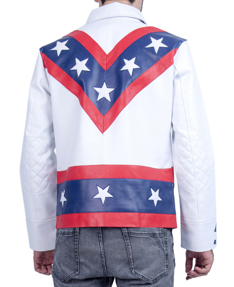The idea of this stylish leather jacket is taken from an american popular television web drama series called daredevil where the veteran stunt performer evel knievel wore this leather biker jacket. He is a very famous stunt performer for such activities. The external side of this evel knievel jacket is manufactured from high and rich quality of genuine leather material. On the internal side of this jacket is a lining of soft and comfortable viscose that will keep you warm and comfortable. The apparel comes in white color. The evel knievel leather jacket has front ykk branded zipper closure. It has open hem cuffs on full length style sleeves. There is a v design on the front and back of this jacket with stars on it. The padded elbows looks comfy.