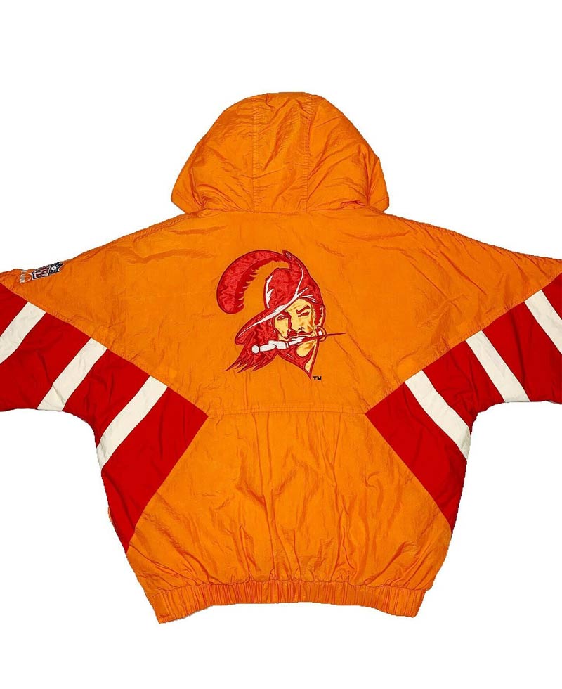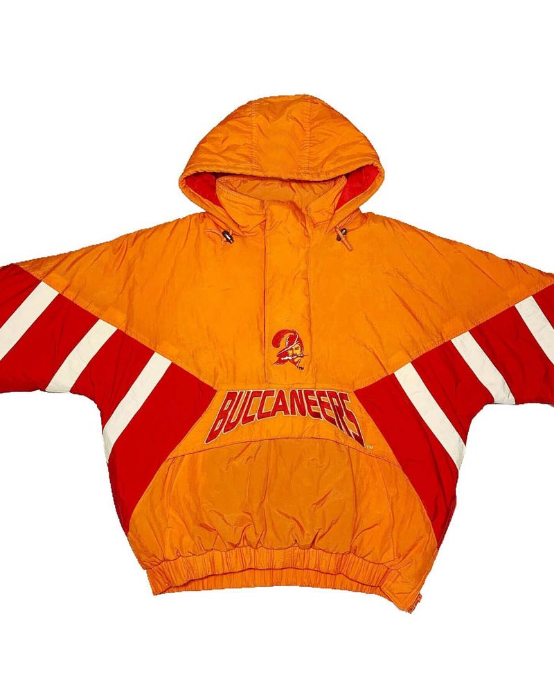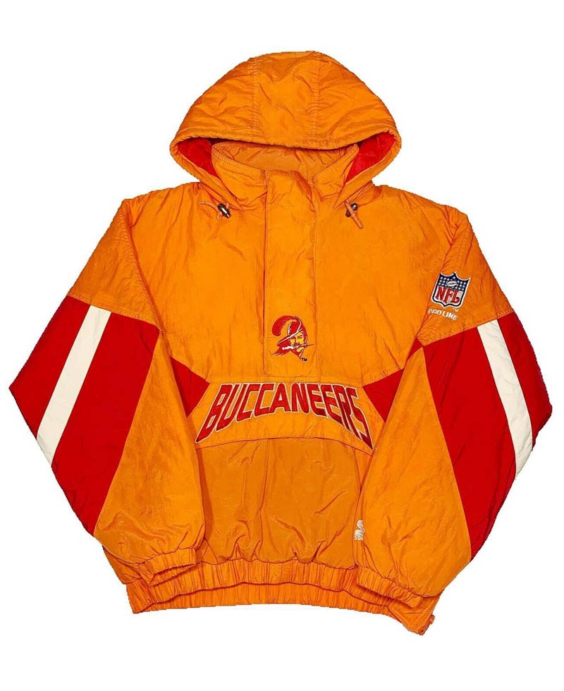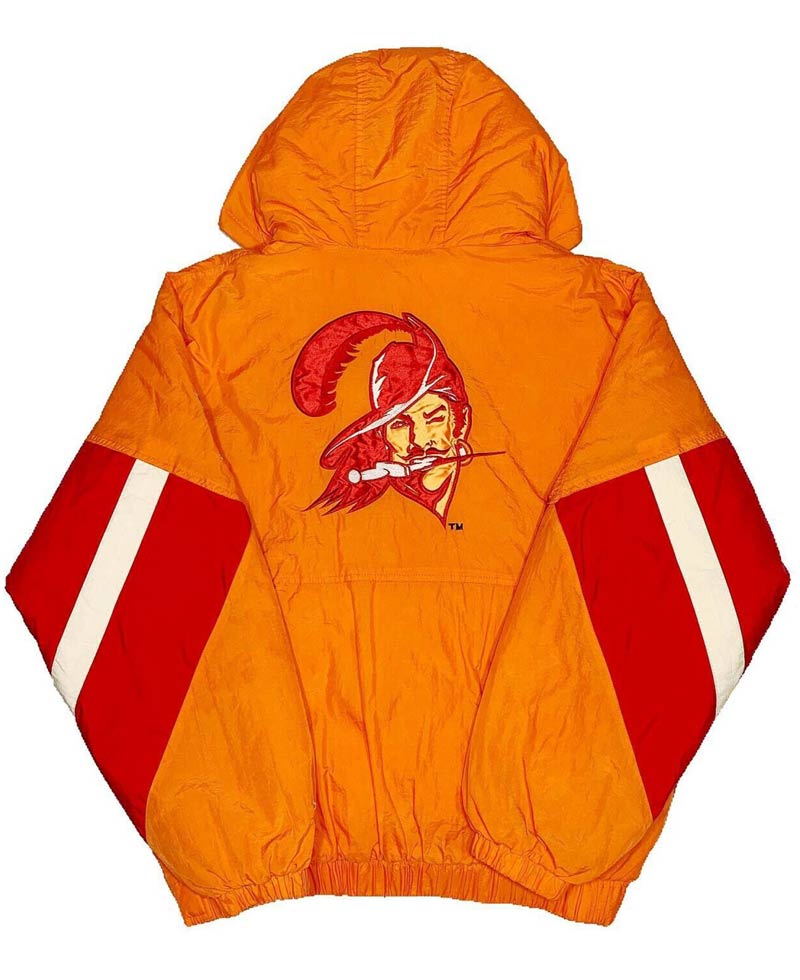 The stylish and classy Bay Buccaneers hoodie is fabricated with parachute fabric of premium quality. On the internal side of this hoodie is a lining of smooth and soft viscose lining that keeps you warm and comfortable all the time. Buccaneers jacket has a vibrant and mesmerizing orange color that makes it desirable to wear. This stylish hoodie has a pullover style. It has a logo of Bucco Buccaneers on its front side and backside that makes it look attractive. Buccaneers starter jacket has an attached hoodie. It comes with two front waist pockets where you can secure stuff. This hoodie has an elastic style hemline. Also, it has elastic style cuffs on full-length style sleeves. This hoodie is perfect for a day out with friends or for casual parties.