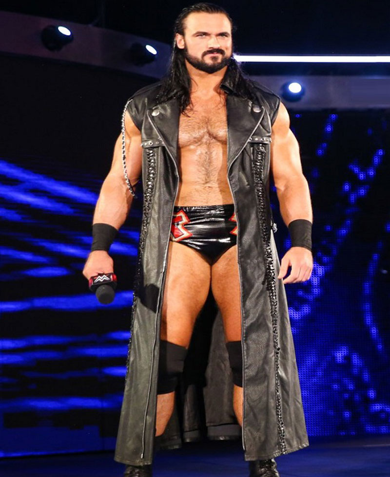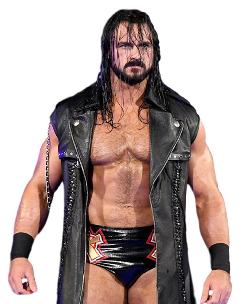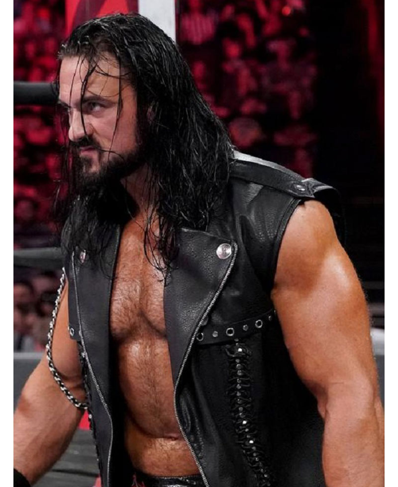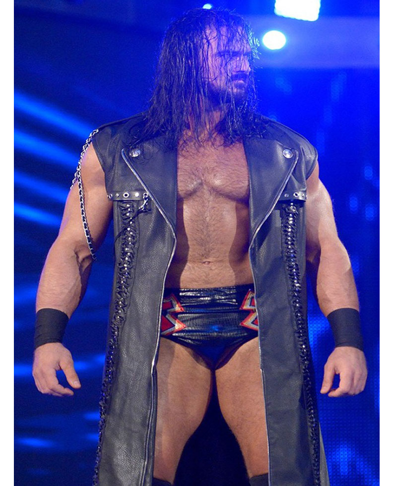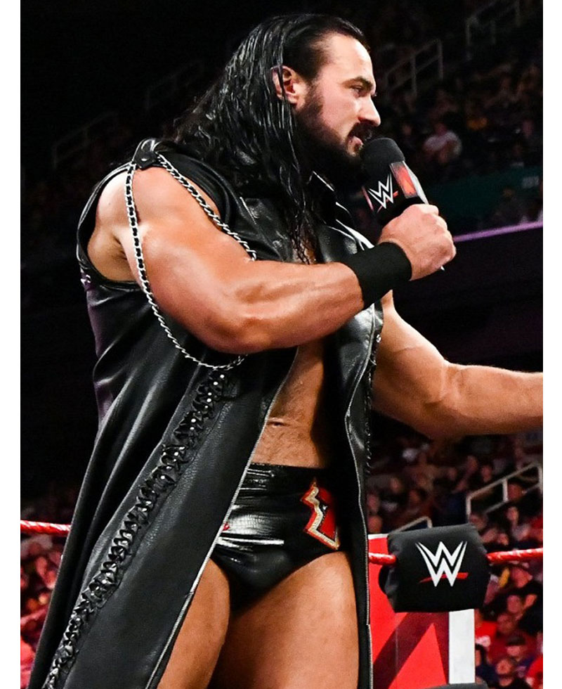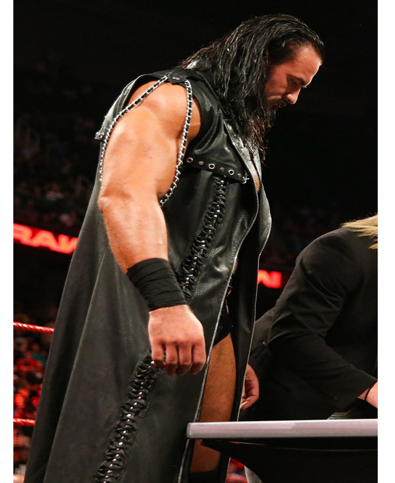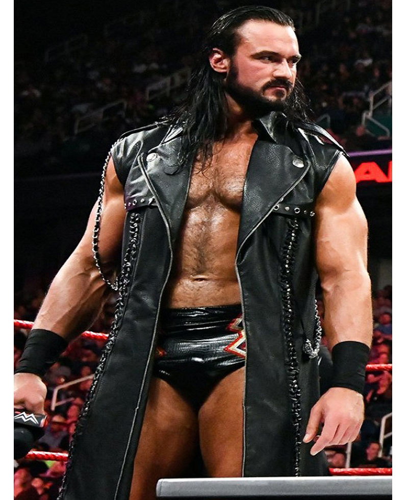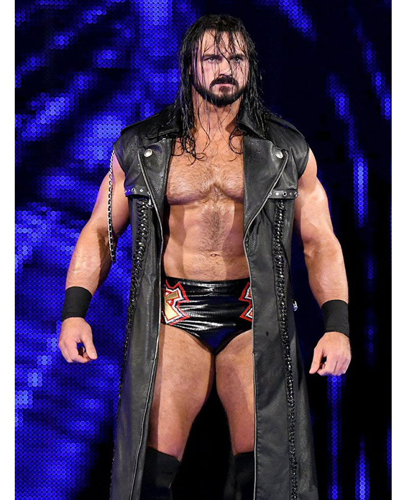 The famous Scottish Professional Wrestler Andrew McLean Galloway who is known for his ring name Drew Mcintyre wore this stylish SummerSlam coat. The external side of this coat is manufactured with premium quality genuine leather material. The Drew Mcintyre coat has an appealing black color. On the internal side of this coat is a lining of smooth and soft viscose attached that keeps you warm and comfortable all the time. The Drew Mcintyre coat has a lapel-style collar as well. The Drew Mcintyre sleeveless leather coat has a ykk branded zipper attached to its front side for the closure. The stylish leather coat has shoulder epaulets as well.