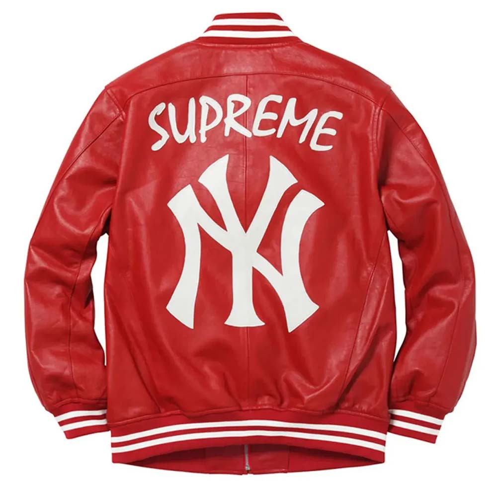 The Supreme New York Yankees Red Jacket Will Fit You Perfectly Like a Glove, It Will Enhance Your Silhouette Perfectly. Its Premium Quality Leather Fabrication Makes It Warm and Luxuriant and Its Soft Viscose Inner Will Keep You Restful and Sweat-free. The Supreme New York Yankees Red Varsity Jacket Has Been Featured by Using Attributes Like a Rib-knitted Stand-up Collar, Smooth Zippered Closure, Rib-knitted Cuffs, a Truly Impressive Hemline, and Side Waist Pockets. There is No Better Way Than the Yankees Red Varsity Jacket to Look Bold, Confident, and Highly Fashioned. Now Get the True Colors of Fashion!