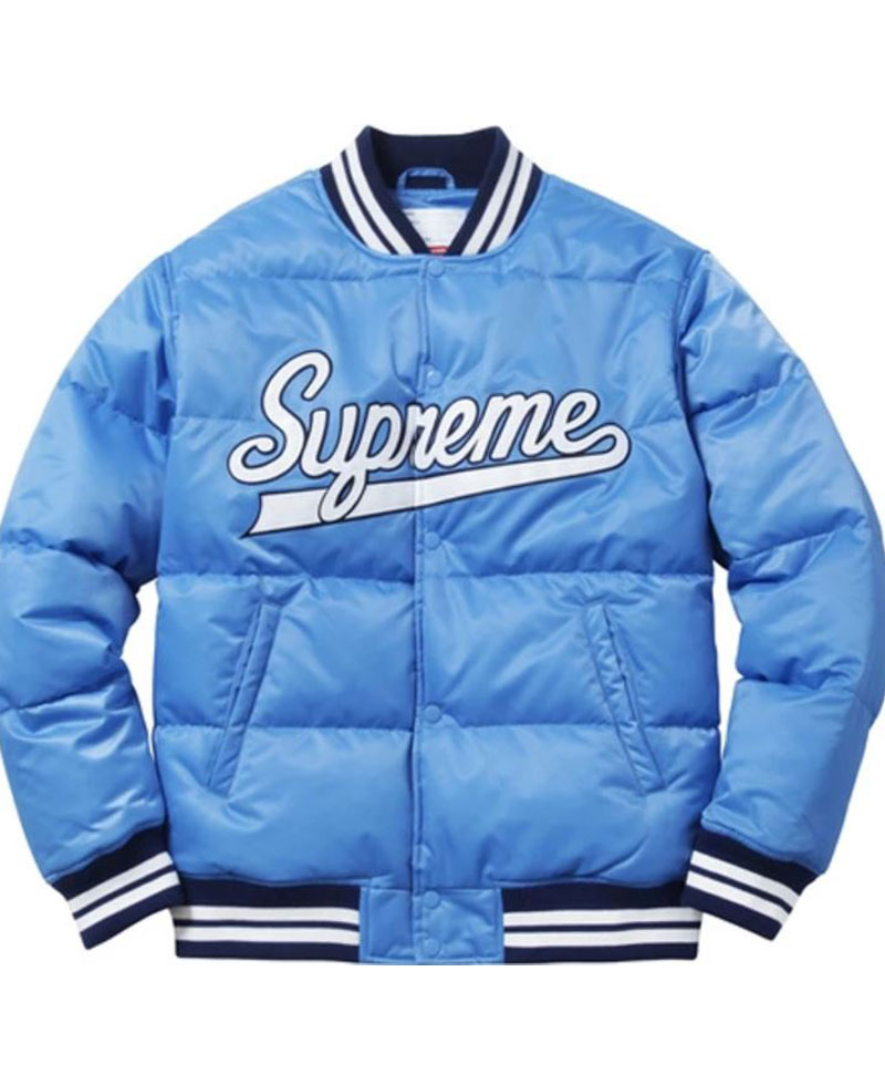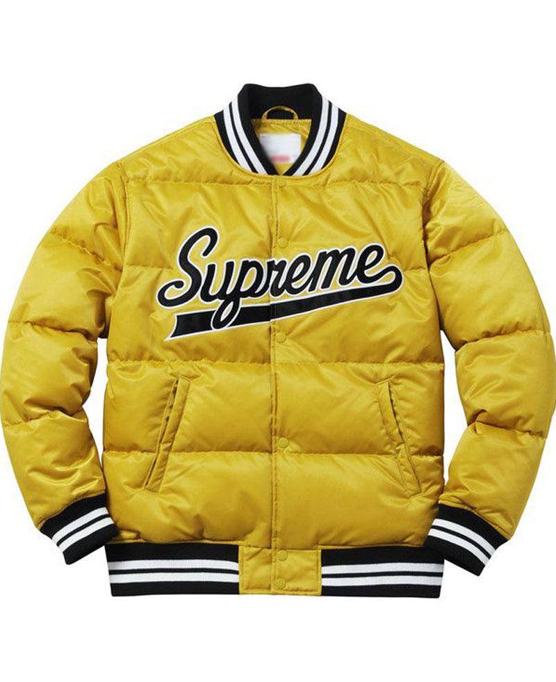 The stylish puffer jacket is what you need this season to make yourself warm and appealing. The external side of this puffer stylish jacket is fabricated with the top quality satin material. On the internal side of this varsity jacket is a lining of smooth and soft viscose attached that keeps you warm and comfortable all the time. Puffy varsity jacket comes in a variety of colors like black, red, yellow, and blue which makes the apparel vibrant to wear. There are snap tab style buttons on the front side of this puffy varsity jacket for the closure. The jacket comes with a rib knitted style collar. Supreme puffy varsity jacket has a rib-knitted style hemline that gives it a fitted look. The long length sleeves on rib knitted cuffs look good. There are two front waist pockets on this jacket where you can keep stuff.