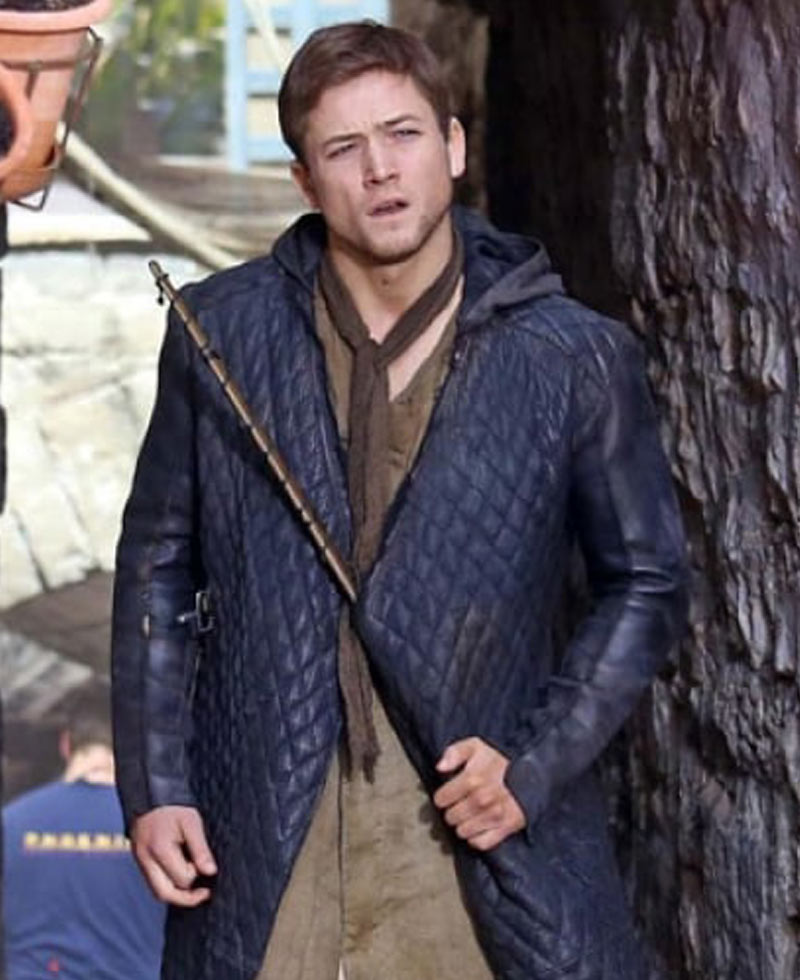 Superstar Taron Egerton wore Robin Hood Coat and introduced an appealing style. Top class leather is used to make the exterior cover of the attire. Durable viscose lining has been given inside. The trench coat style is fabulous and makes everyone captivating. Two pockets are present on front side. Robin Hood Taron Egerton Coat is long in size. For cold season hoodie is present. Hoodie is attached with collar. Open front closure is sophisticated and easy in wearing. Quilted pattern designing is given all over the front part of Robin Hood Trench Coat which is looking phenomenal. Long sleeves end on open hem cuffs. Dark blue color is mesmerizing.