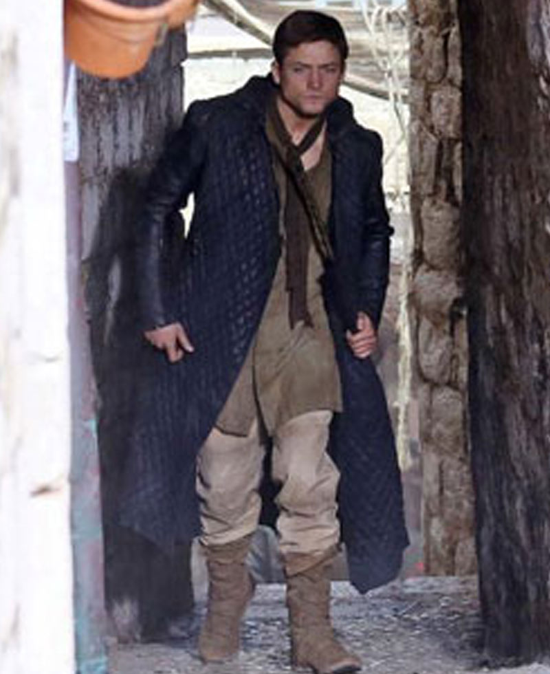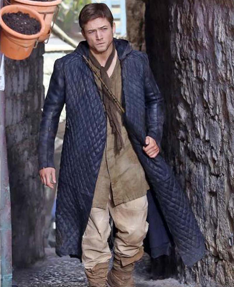 Taron Egerton Robin Hood Diamond Quilted Blue Leather Trench Coat