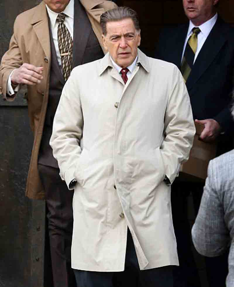 jimmy hoffa coat is manufactured from an enduring and reliable quality of the material. The material we used in the manufacturing of this outfit is cotton. This coat keeps you feel comfortable because it contains an inner soft viscose lining. This coat will no doubt give you a stylish look. This coat will protect you from cold weather. the irishman al pacino coat has lapel style collar. This jimmy hoffa coat has front buttoned style closure that fits in perfectly with the style of this coat. This coat has full length style sleeves with open hem cuffs and belted buttoned strap on it. This trench coat has front pockets as well. This coat comes in white color. You won’t regret after buying this coat, we assure you. So, without wasting much time order this coat right now.