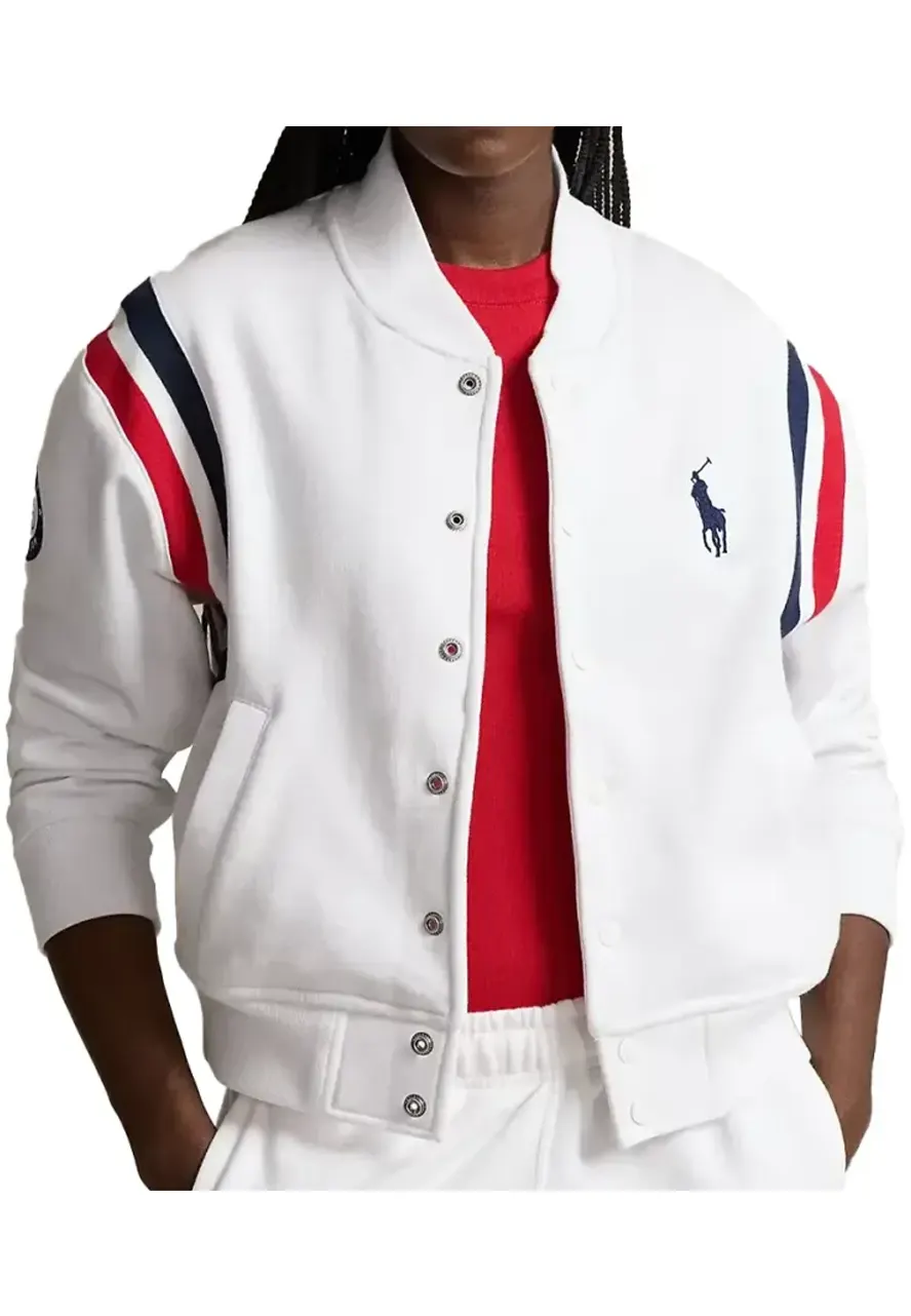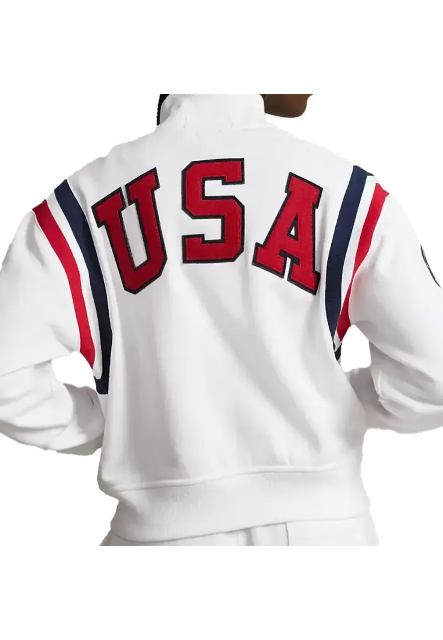 The Today Show Martha Stewart Team Usa Jacket in Not Only Warmth and Stylish but Also a Functional and Fashionable. It Will Keep Your Style at a High Level of Fashion and Enrich Your Winter Look With Charm. The Exquisite Jacket Has Been Fabricated by Premium-quality Wool to Make It Warm and Ageless, While Its Soft Viscose Inner Makes It Comfortable and Moisture-free. The White Color of the Jacket Will Give You Angelic Looks. The Martha Stewart Varsity Jacket Has Been Tailored With Rib-knitted Stand-up Collar, Snap Tab Buttoned Closure, Rib-knitted Cuffs and Hemline, Side Waist and Inner Pockets. The Team Usa Varsity Jacket Has a Timeless Elegance That Makes It Perfect for Any Occasion.