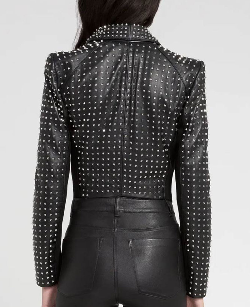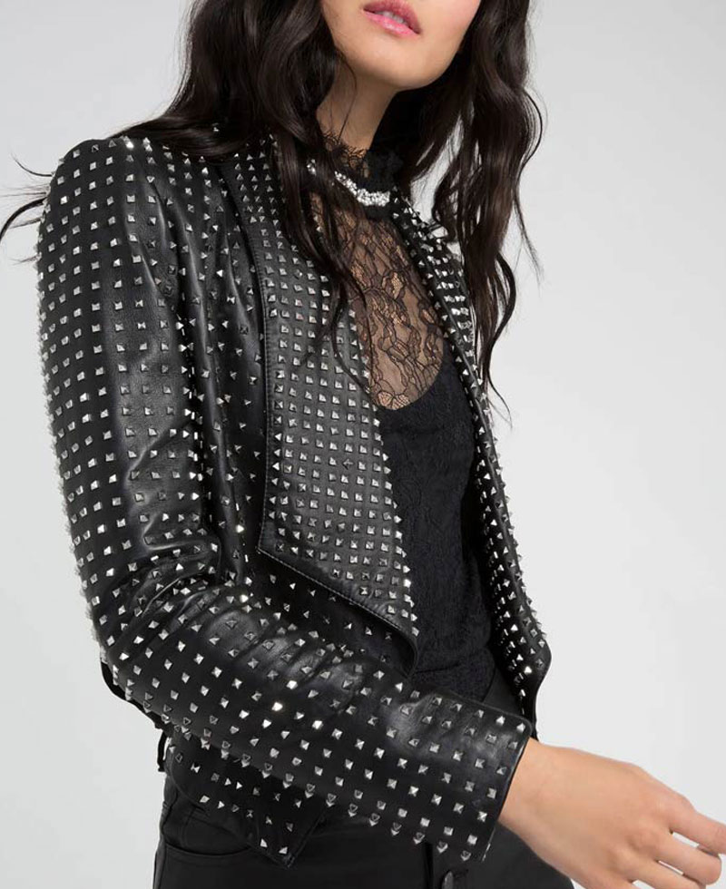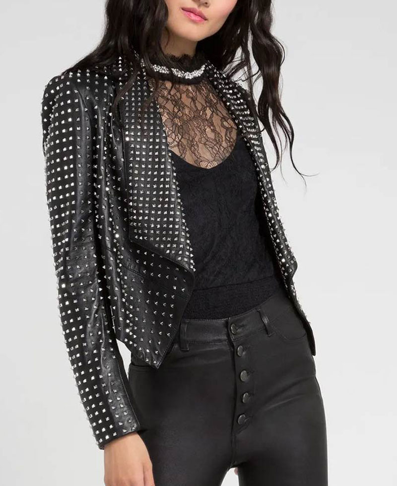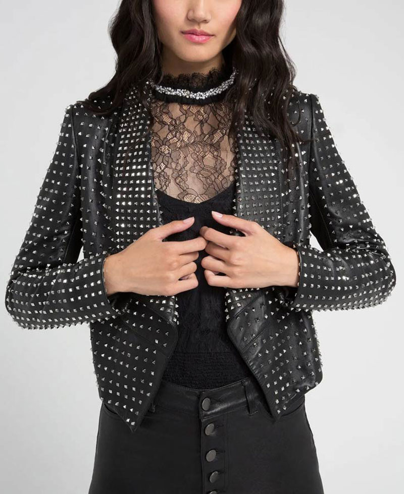 The idea of this leather jacket is taken from the American popular reality web television drama series called The Real Housewives of Beverly Hills where the American actress Kyle Richards wore this studded stylish leather jacket. The external part of this The Real Housewives of Beverly Hills Kyle Richards studded leather jacket is manufactured with premium and rich quality of genuine leather material. The jacket comes in black color. On the internal side of this leather jacket is a lining of smooth and soft viscose lining that keeps you warm and comfortable all the time. The Real Housewives of Beverly Hills Kyle Richards studded leather jacket comes with an open front look that seems attractive. The jacket has studs on its front and backside. There is a wide lapel style collar on this jacket as well. This jacket comes with open hem style cuffs on full length style sleeves.