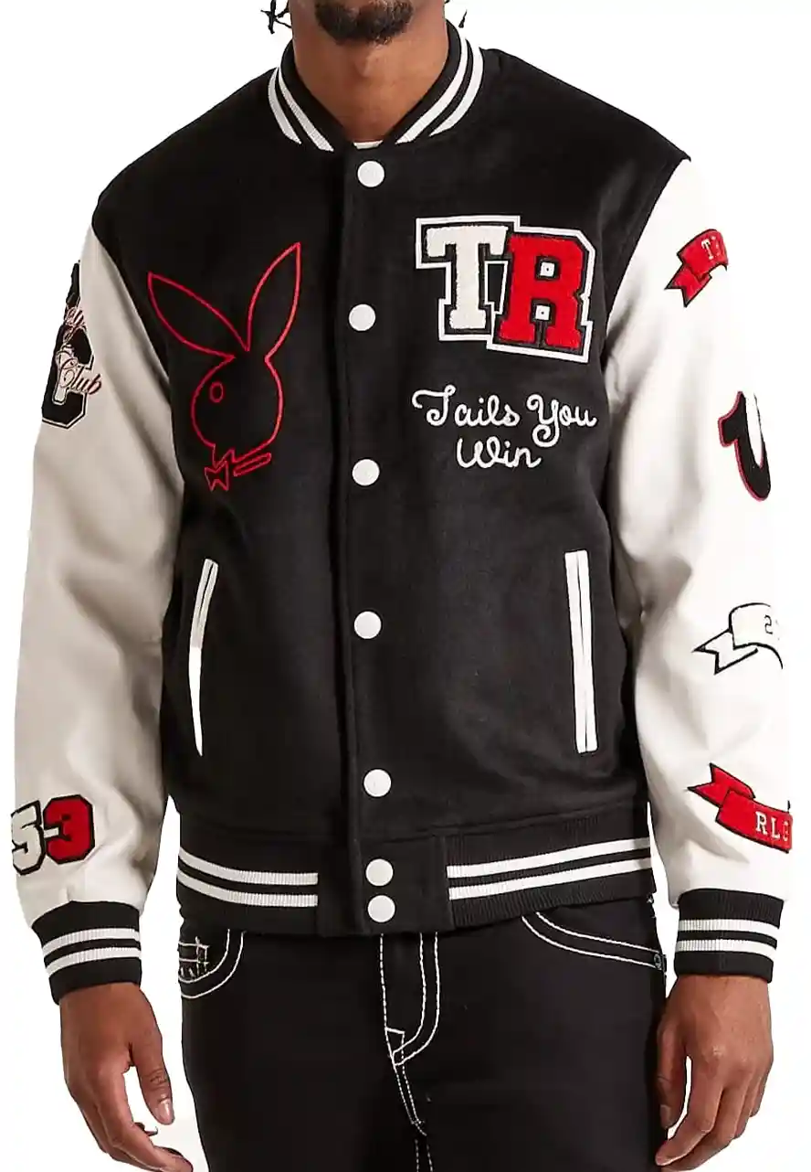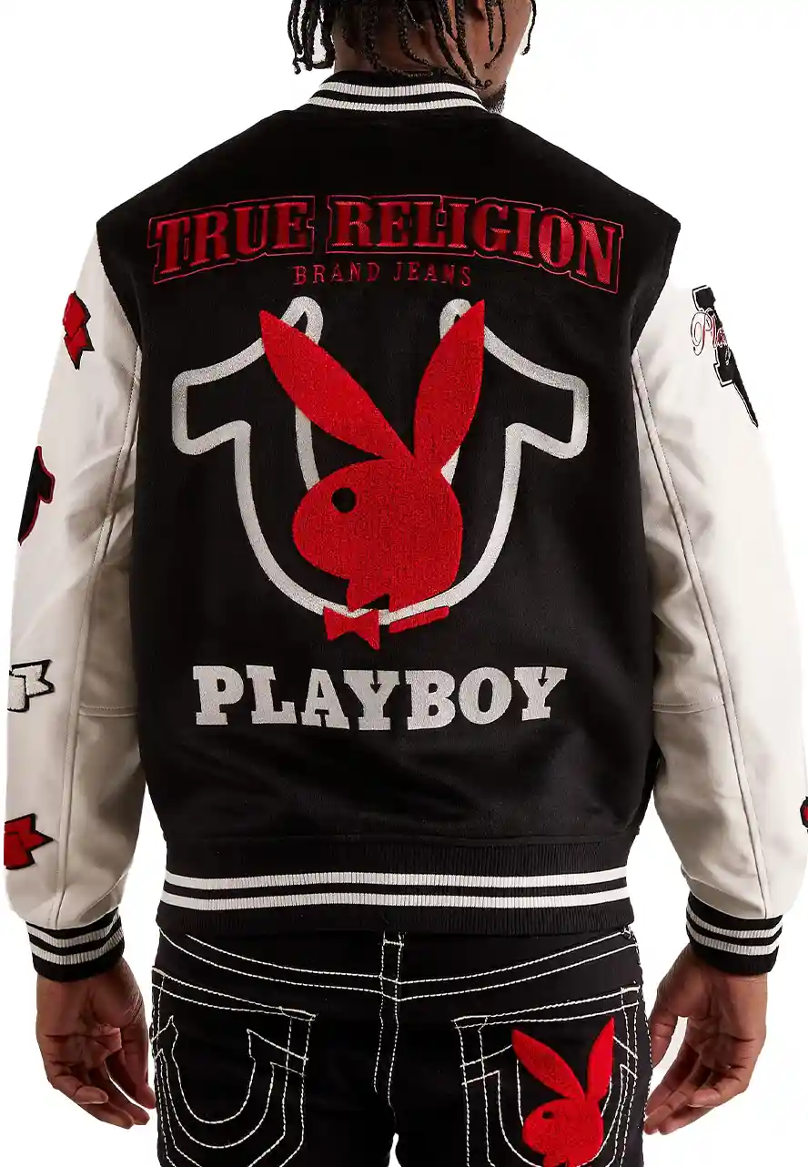 The True Religion Playboy Bunny Varsity Jacket Will Give You a Certain Charisma That is Really Impressive. Whether You Are Going for Workplace or Any Adventurous Trip, This Jacket Will Stand You Out From the Crowd. The playboy bunny varsity jacket Has Been Fabricated by Premium-quality Wool to Make It Warm and Ageless, While Its Soft Viscose Inner Makes It Comfortable and Moisture-free. The Strong Black Color Will Look Stunning on You. The True Religion Varsity Jacket Has Been Tailored With All Smart Features Like Rib-knitted Stand-up Collar, Snap Tab Buttoned Closure, Rib-knitted Cuffs and Hemline, and Two Side Waist and Inner Pockets to Make It More Functional. The Playboy Bunny Varsity Jacket Will Give You Combo of Classic Style With Modern Flair.