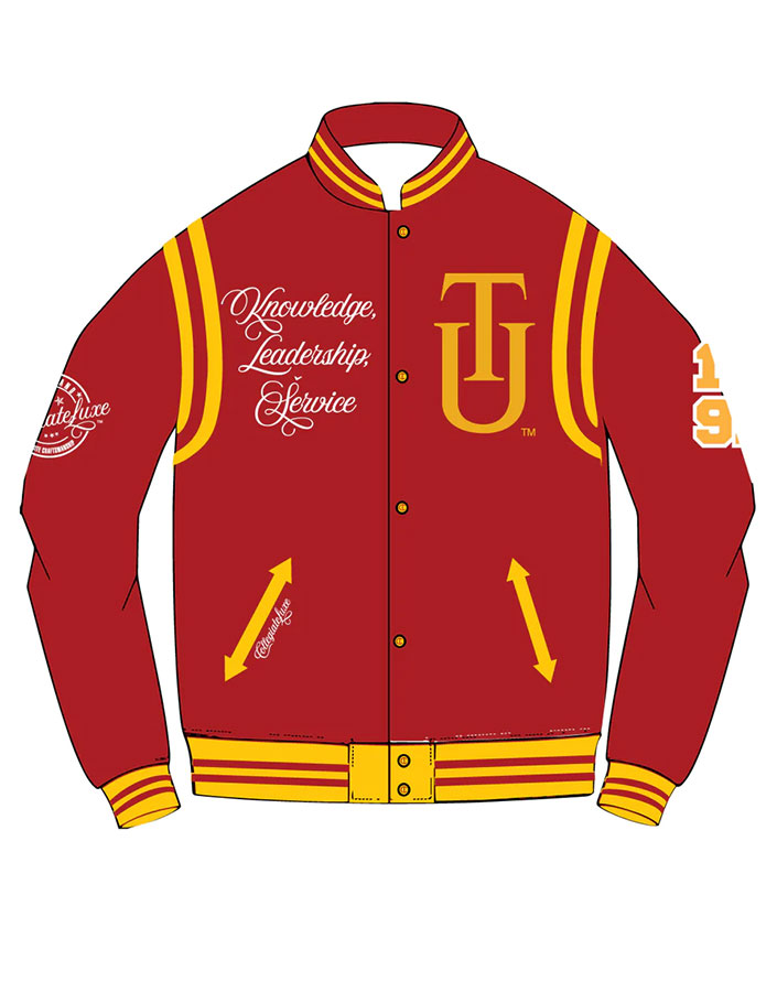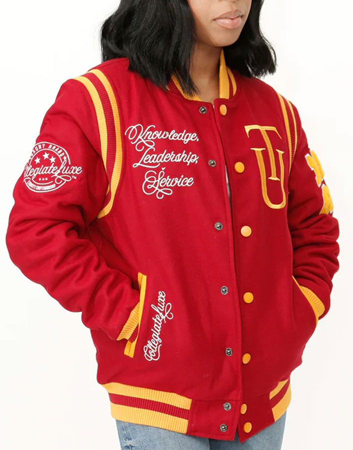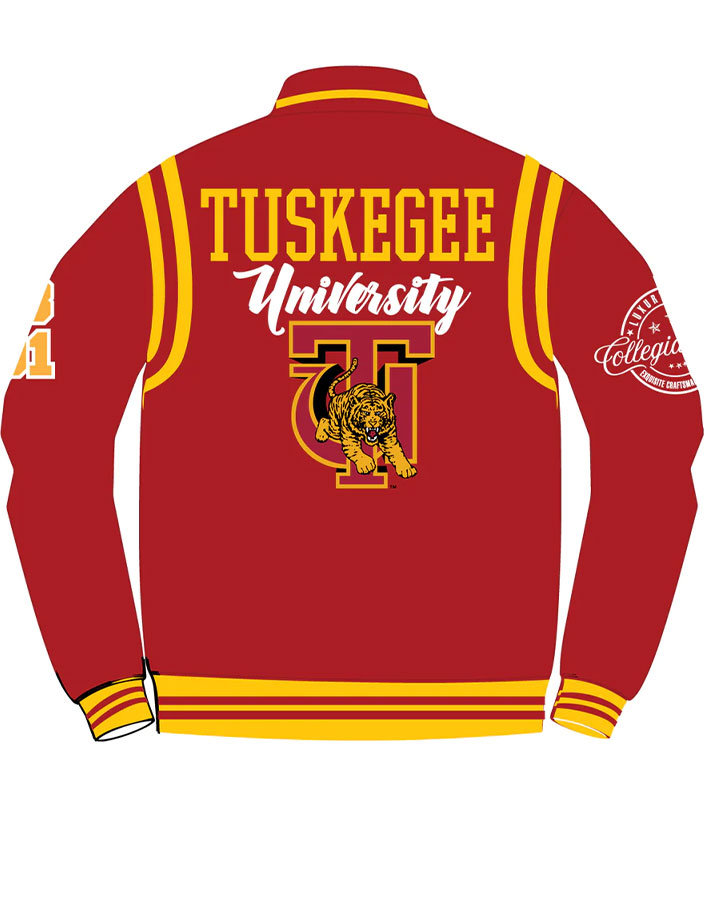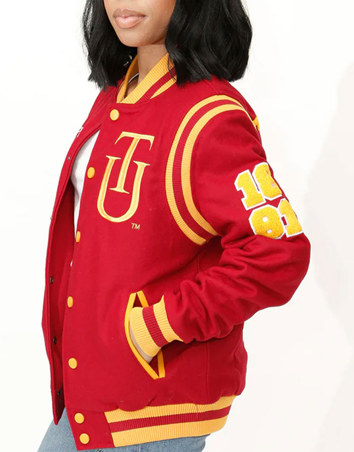 The Tuskegee University Varsity Jacket is Chic and Classy, You Will Look More Confident and Sturdy Whether You Are Going to Academy or Hang Out With Your Pals. Its Premium Quality Wool Fabrication Makes It Warm and Ageless and Its Soft Viscose Inner Will Comfy You as Long as You Wear It. The Maroon Color Will Complement Your Skin. Rib-knitted Stand-up Collar, Snap Tab Buttoned Closure, Rib-knitted Cuffs, and Hemline and Side Waist Pockets have featured in the Tuskegee University Varsity Red Jacket. The Tuskegee Jacket is for All Those Who Like to Wear Timeless Varsity Jacket.