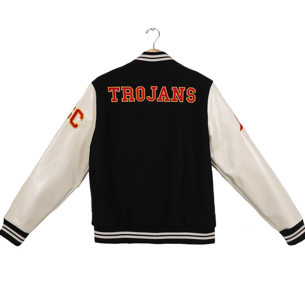 The Usc Trojans Varsity Jacket Will Suit Your Style Perfectly and Elevate Your Entire Casual or Party Look, It is the Perfect Combination of Style and Glamour to Exude Your Energy and Confidence. Its High-quality Wool Fabrication Makes It Warm and Ageless Along With Its Soft Viscose Inner Makes It Comfortable and Sweat-free. The combination of Black and White Colors Will Look Fantastic on You. The Usc Trojans Letterman Jacket Has Been Designed Modishly by Using Impressive Features Like a Rib-knitted Stand-up Collar, Solid Snap Tab Buttoned Closure, Rib-knitted Cuffs and Hemline and Side Waist Pockets. The Usc Trojans Jacket is a Stand Out Piece, Everyone Will Dmire The Retro Charm of Your Personality.