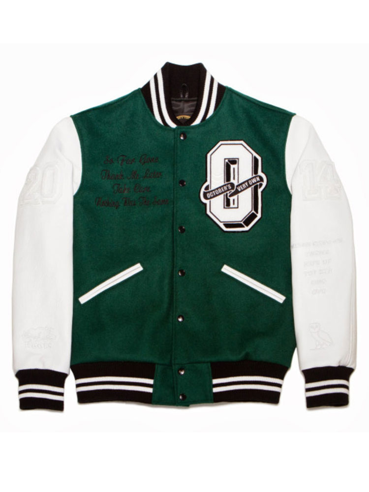 The stylish Letterman Jacket comes in a deep and mesmerizing green color. The external side of this jacket is fabricated by using top-quality wool fabric. The letterman jacket uses a premium quality genuine leather material for making the sleeves. Letterman Jacket has an internal lining of smooth and soft viscose that keeps you warm and comfortable all the time. The fine quality stitching makes this Drake’s varsity jacket durable to wear. There is an erect style collar on this stylish letterman jacket. October’s Very Own Green varsity jacket has two front waist pockets where you can secure stuff. The white detailing on this jacket makes it attractive. The October’s Very Own Green varsity jacket has a rib-knitted hemline. The jacket has buttons attached to its front side for closure. This jacket comes with rib knitted cuffs on full length sleeves.