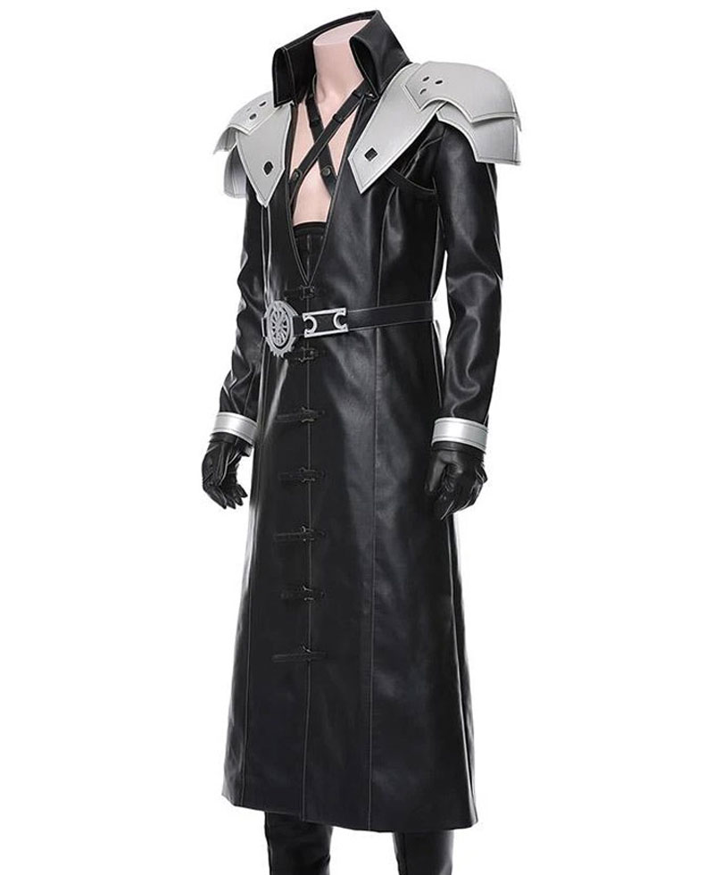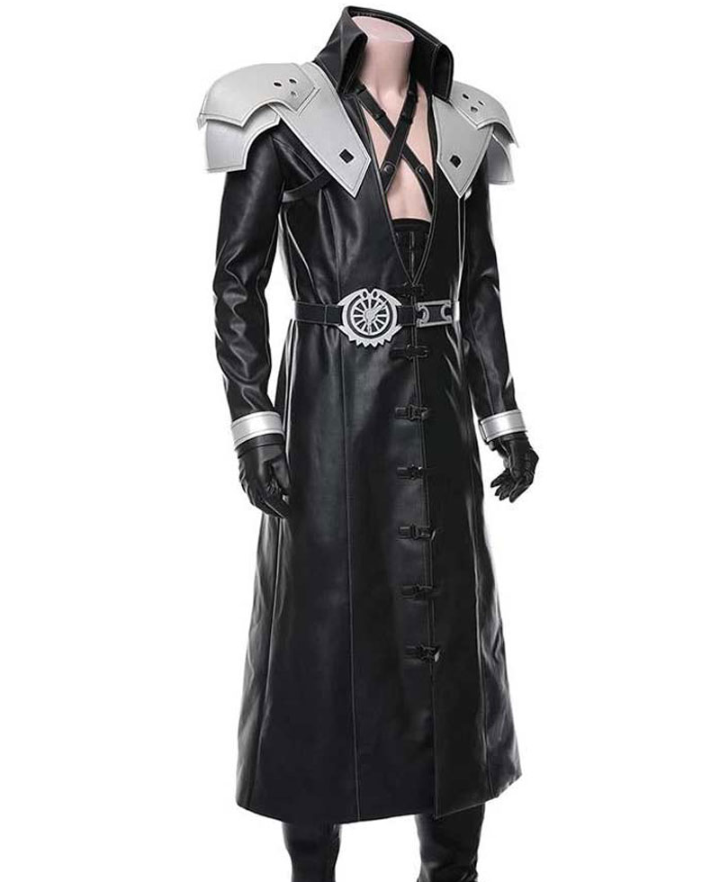 The idea of this coat is taken from a video game series titled as final fantasy 7 where the game character Sephiroth wore this leather coat. The Final Fantasy 7 Remake Sephiroth Leather Coat is manufactured from high quality faux leather material. The coat is available in classic black. The Sephiroth Coat has a shirt style collar. The inner of the coat consists of a soft viscose lining that keeps you warm and comfortable against old weather. The Final Fantasy 7 Remake Sephiroth Leather Coat comes with full length style fitted sleeves along with classic open hem cuffs and silver padded designed shoulders. At the chest the coat has a X leather strap. The Final Fantasy 7 Remake Sephiroth Leather Coat is long in length. There are two pockets on the internal side of this coat where you can secure your stuff. On the front of this leather coat, you will find buckles for closure.