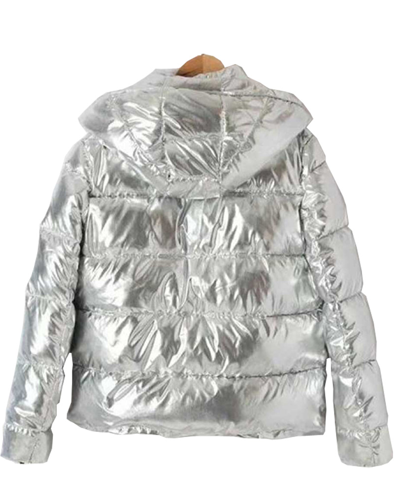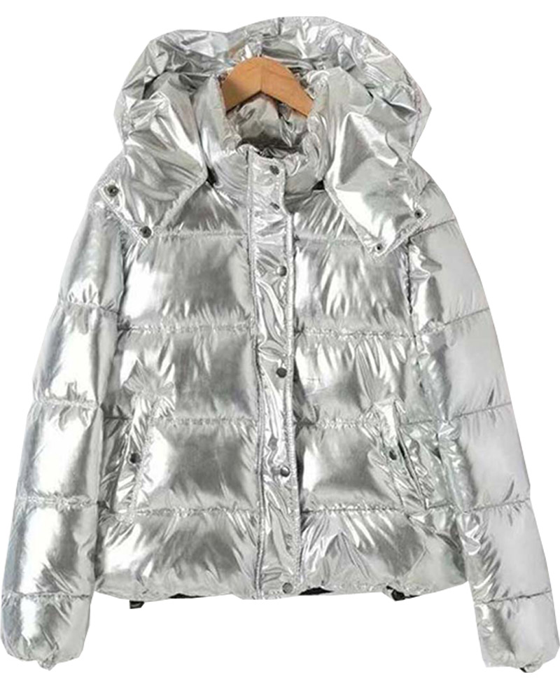 Women’s Puffer Metallic Silver Down Jacket with Removable Hood