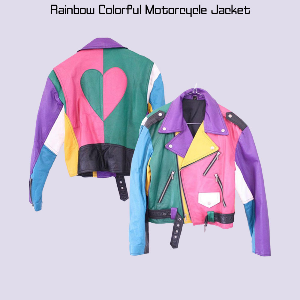 The colorful leather jacket is designed for women. The vibrant and attractive rainbow colors make the appearance of this biker jacket more delightful. The external layer of this motorcycle jacket is manufactured with premium quality genuine leather material. The colorful leather jacket has an internal lining of smooth and soft viscose that guards you against cold weather and keeps you wrm. The jacket has fine quality stitching. There is an asymmetrical zipper attached to the front side of this rainbow moto jacket for closure. The jacket has a notch lapel-style collar. It has shoulder epaulets as well. The rainbow moto jacket has zipper-style cuffs on full-length style sleeves. There are three zipper pockets on the front side of this leather jacket. Lastly, the jacket has a belted hemline too.