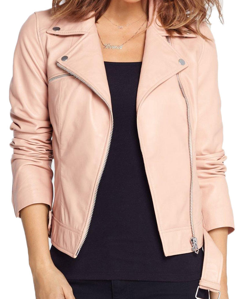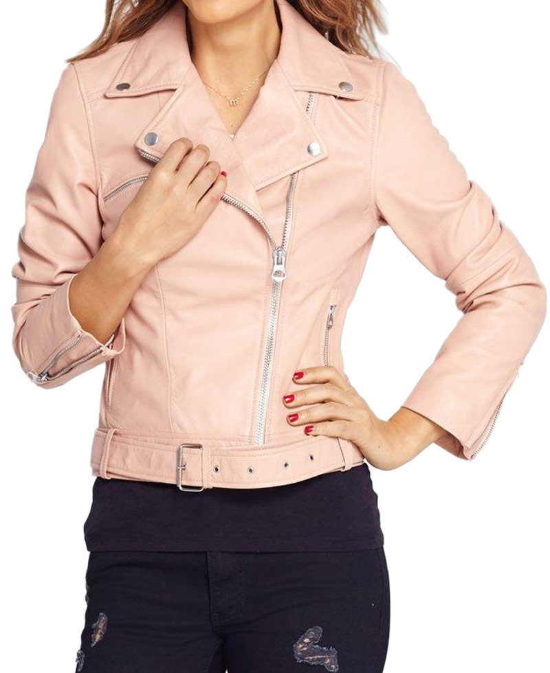 Women’s Asymmetrical Baby Pink Belted Leather Jacket