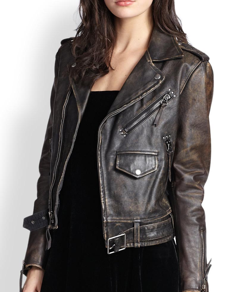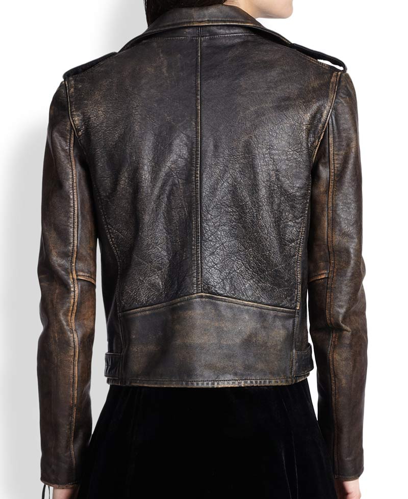To achieve a stylish and polished outfit without looking like you put effort in it was considered a hard task. But due to these recent fashion trends of distressed look to the attire can help to achieve the laid back look without looking sloppy. Best choice for this trend is distressed leather motorcycle jacket. Women’s distressed leather jacket is in contemporary brown color and available in genuine leather. Distressed leather motorcycle jacket has asymmetrical zipper closure and lapel collar for a unique look. Zipper pockets are present on one side of chest and waist; a flapped pocket is present on waist. To add a rough vibe to the women’s distressed leather jacket, zipper cuffs are present on full sleeves. For adjustment buckle belt is added on hemline of distressed leather motorcycle jacket and for fashion purpose loop detailing on shoulder is also added.
