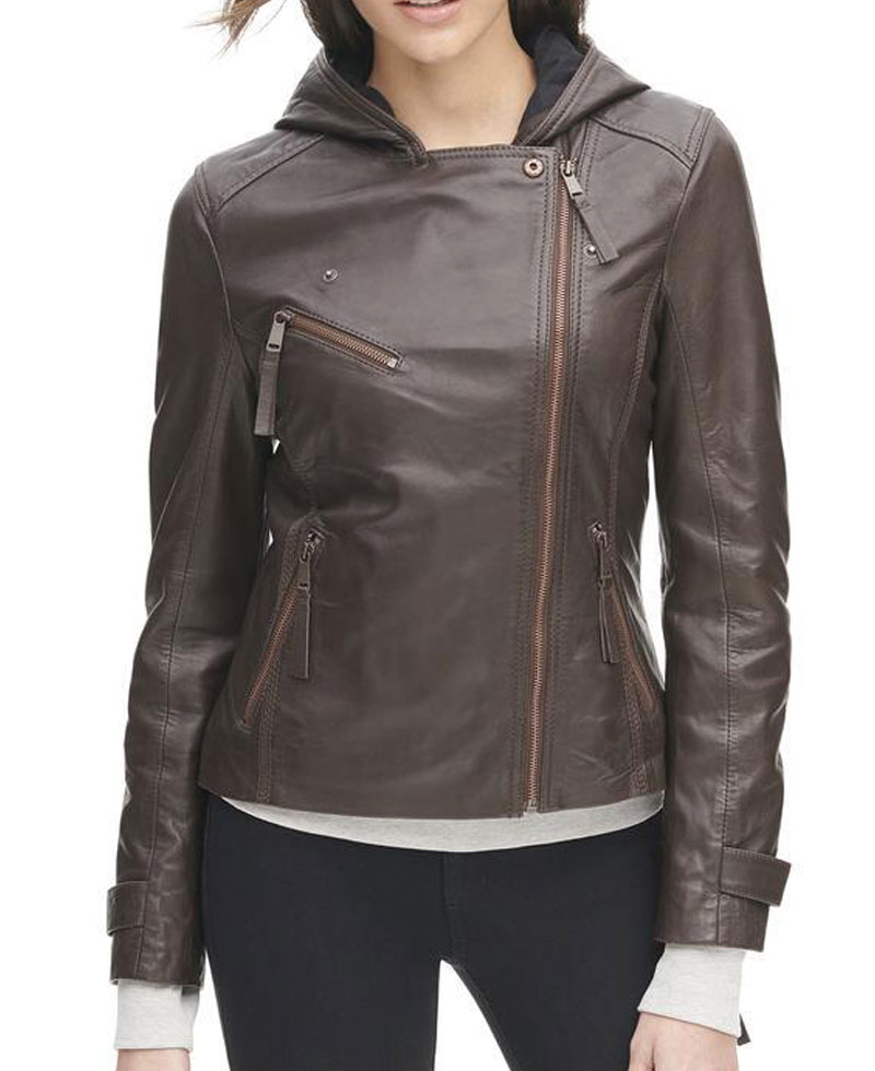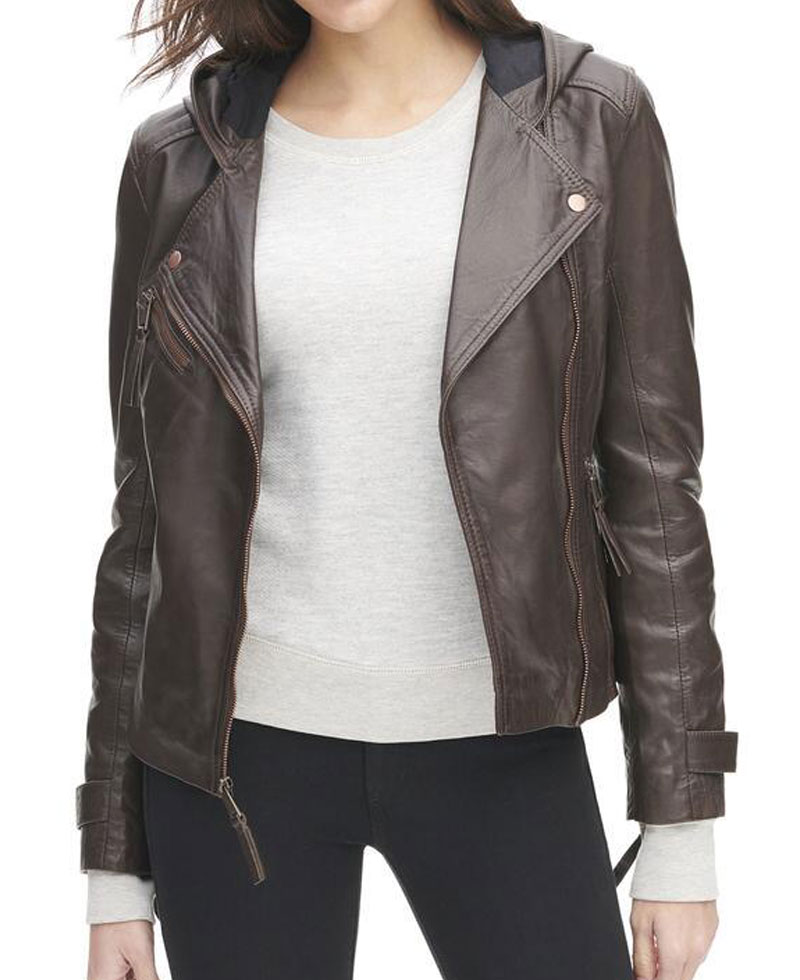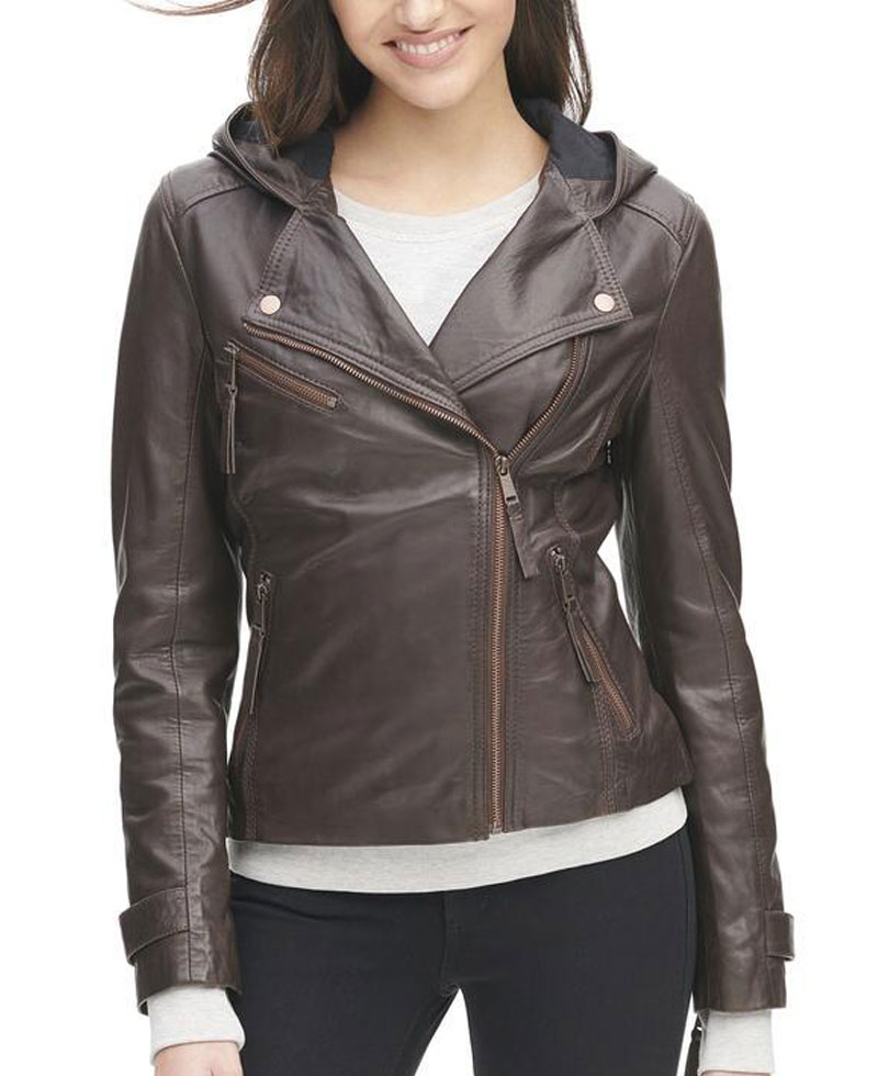 Womens Asymmetrical Zipper Biker Brown Leather Jacket with Hoodie