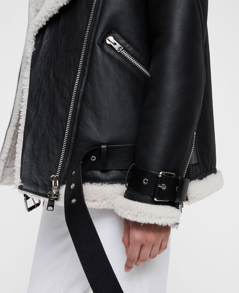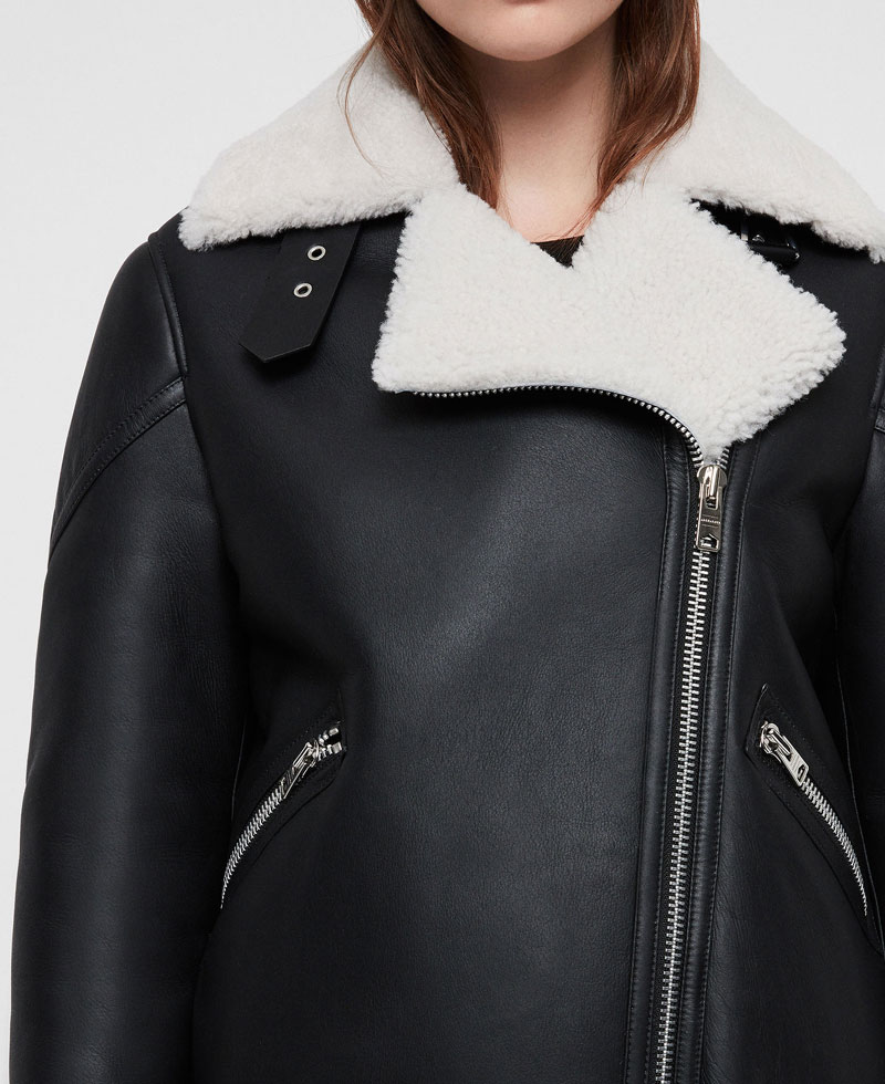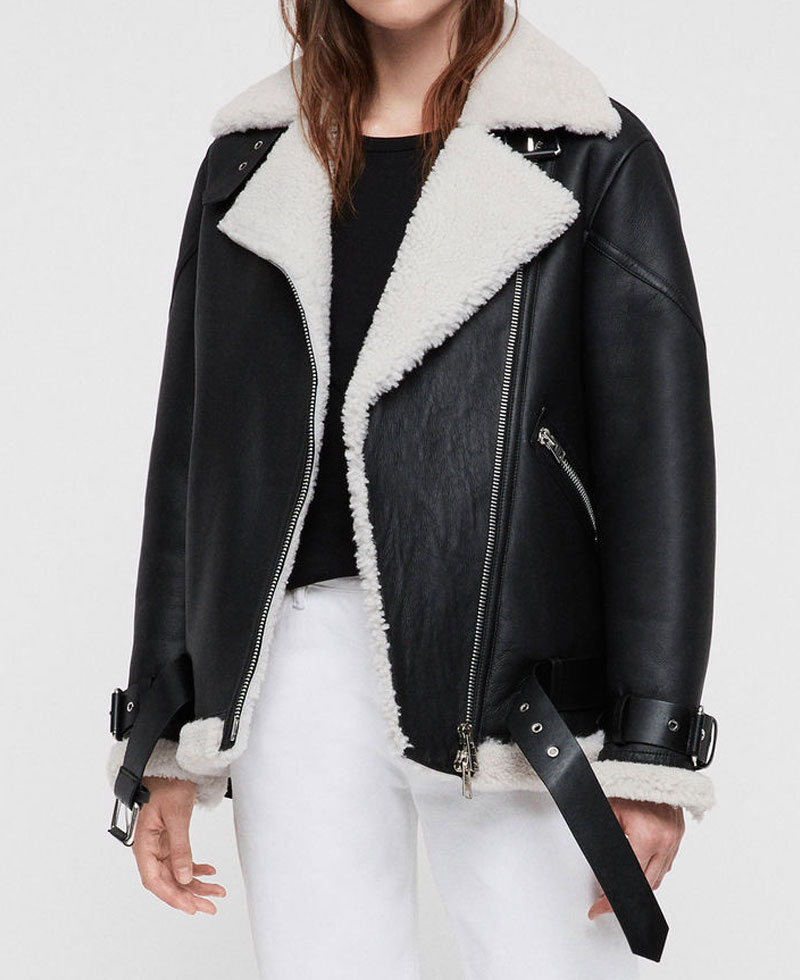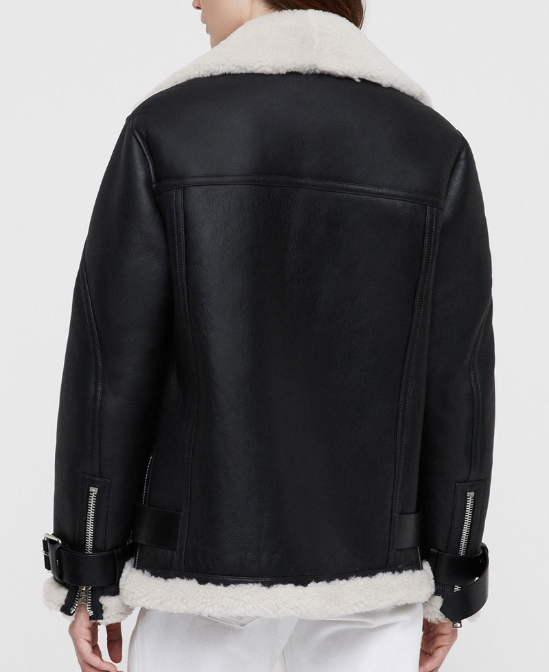 shearling biker jacket womens is fabricated from high and good quality of genuine leather material. The long lasting material is used in the manufacturing and is guaranteed. This jacket is very comfortable  as it contains inner soft shearling lining. This jacket will guard you against cold climate and will make you feel warm and cozy. womens black leather shearling jacket has full length sleeves with belt on the cuffs. This leather jacket has front ykk branded zipper style closure that fits in perfectly with the style of this jacket. This jacket has shearling notch style collar. There are front zipper pockets on this jacket. You will love the detailing of this jacket. You can wear this jacket casually or can also carry this for an occasion. This jacket is available here in a black color. Order this jacket right now and get your hands on it.