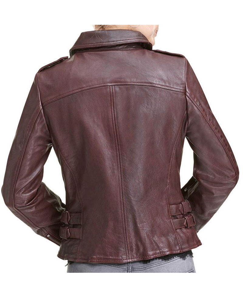 Womens Asymmetrical Zipper Biker Burgundy Leather Jacket