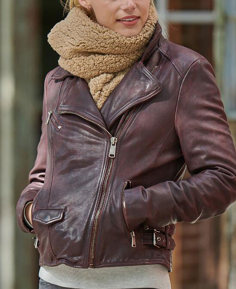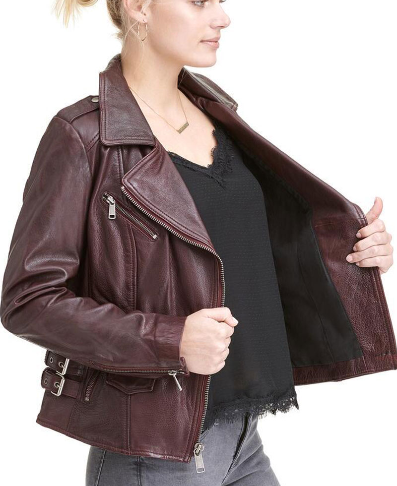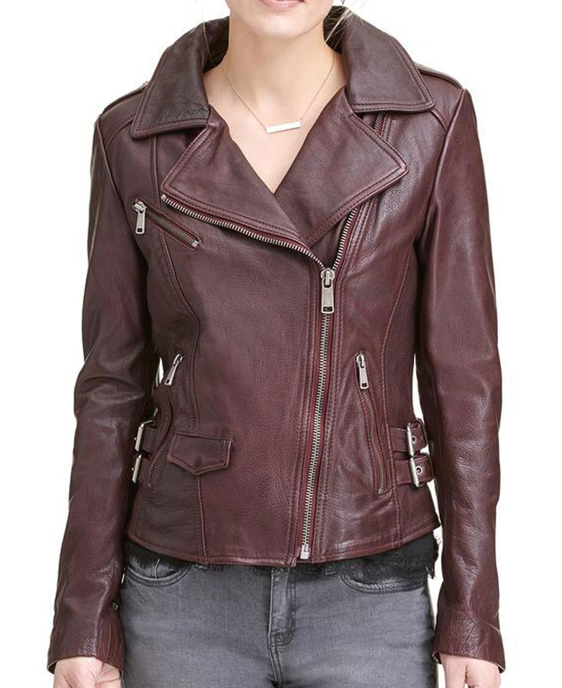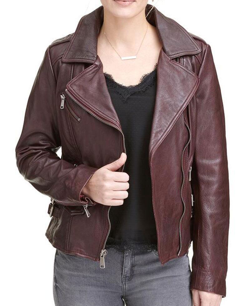 women’s asymmetrical moto burgundy leather jacket is manufactured from a reliable quality of genuine leather material. The stuff we use in the production of this jacket is good, lasting and of high quality. This jacket will shield you against cold climate and will make you feel warm and cosy. This jacket will give you a very appealing sight. The inner soft viscose lining makes this outfit very comfortable that you can carry it all day long. womens biker burgundy leather jacket has a notch style collar. This jacket has zippered cuffs with full length style sleeves. The front zipper closure gives this jacket an appealing impression. There are two zippered hand pockets along with one zippered chest pocket. You can get this stylish and casual wear in burgundy color. Do order your piece right now without wasting further time. You would not regret once after buying this jacket.