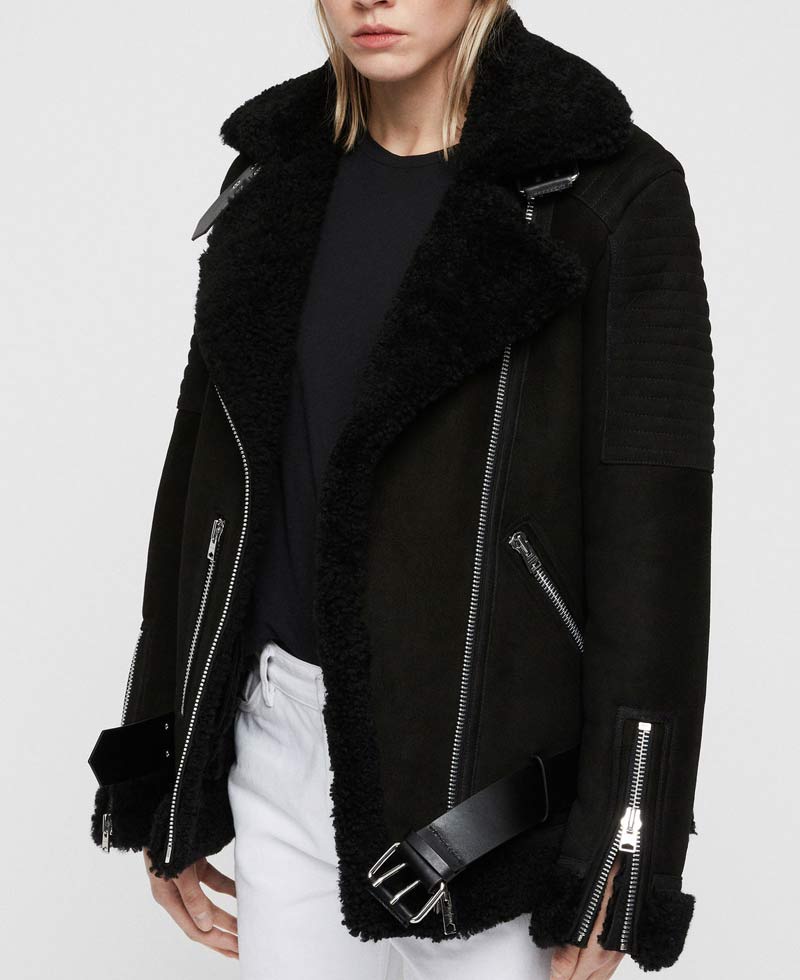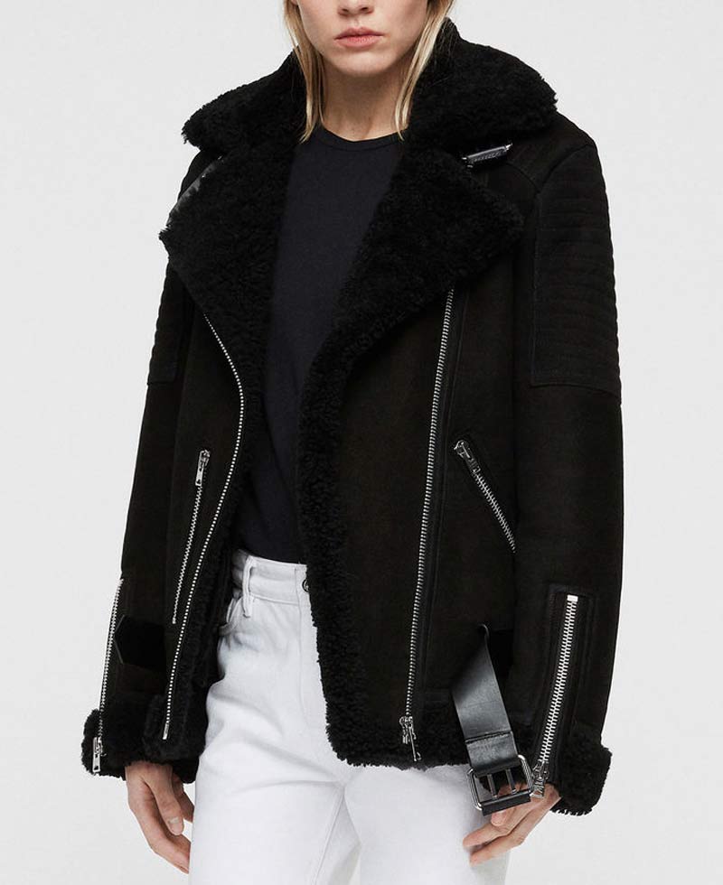 Women’s Shearling Motorcycle Black Suede Leather Jacket with Fur Collar