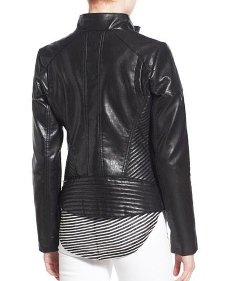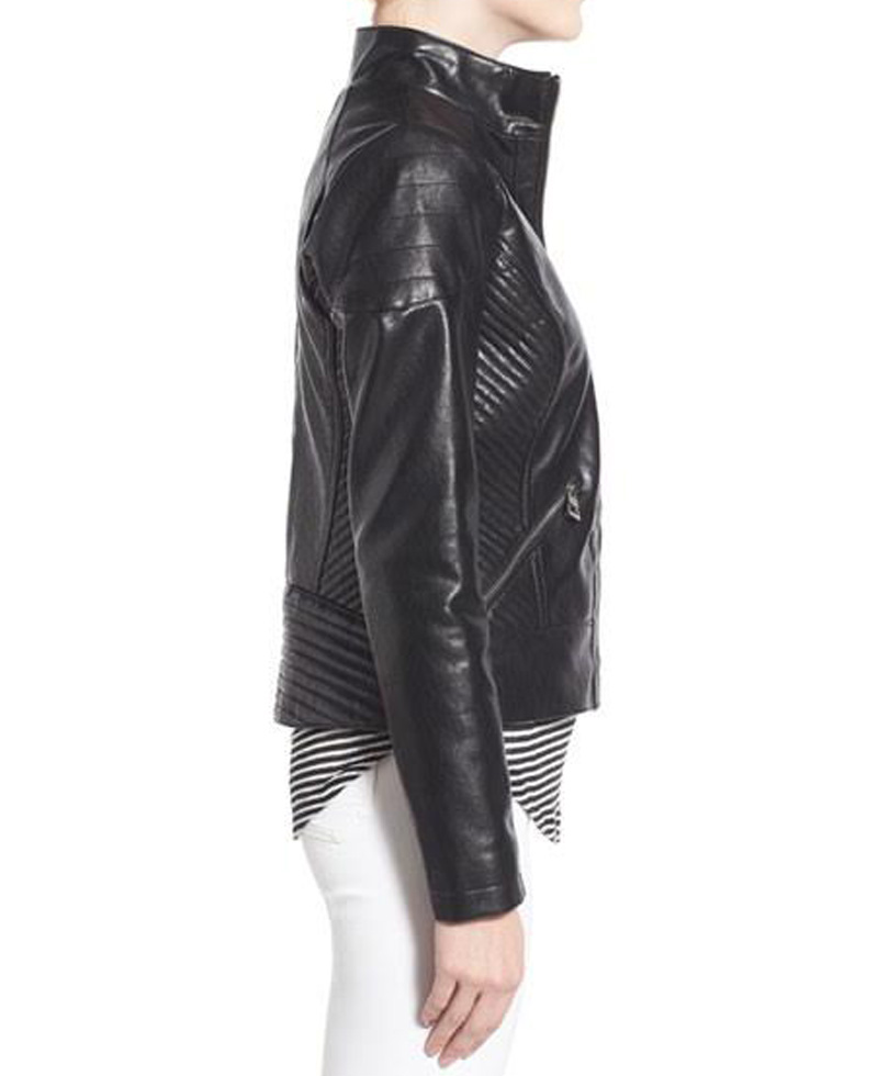 Walk with style. Try our new trendiest outfit especially design for new generation ladies. Stand collar jacket is crafted so beautifully in attractive black color. It has been fabricated in faux leather with viscose material inner. It holds stand up collar with zip terminating front gives it outlook. There are three stylish zipper pockets one is present on chest side and two zipper pockets on waist side makes it lavish and pretty. The most dominant feature of the black faux leather jacket women is quilted designing at back and waist makes it outstanding apparel. It also has padded detailing at shoulder along full sleeves make you appearance classy.