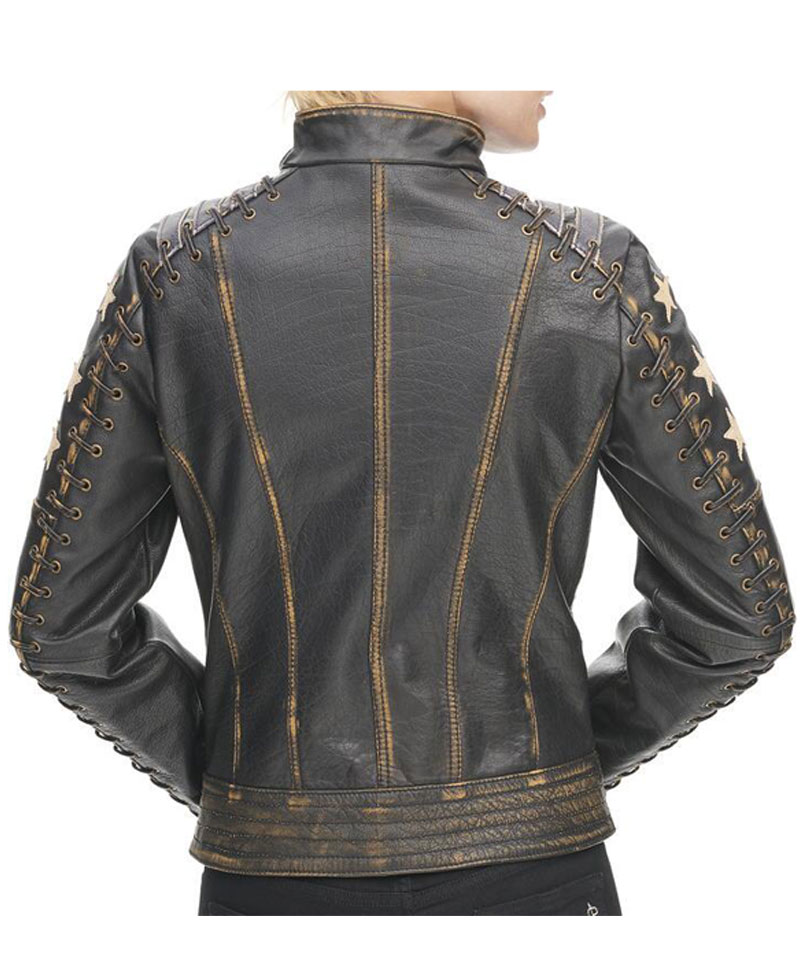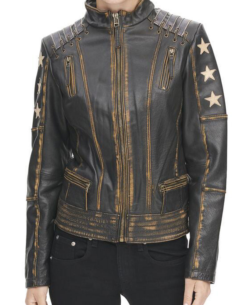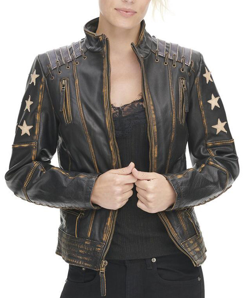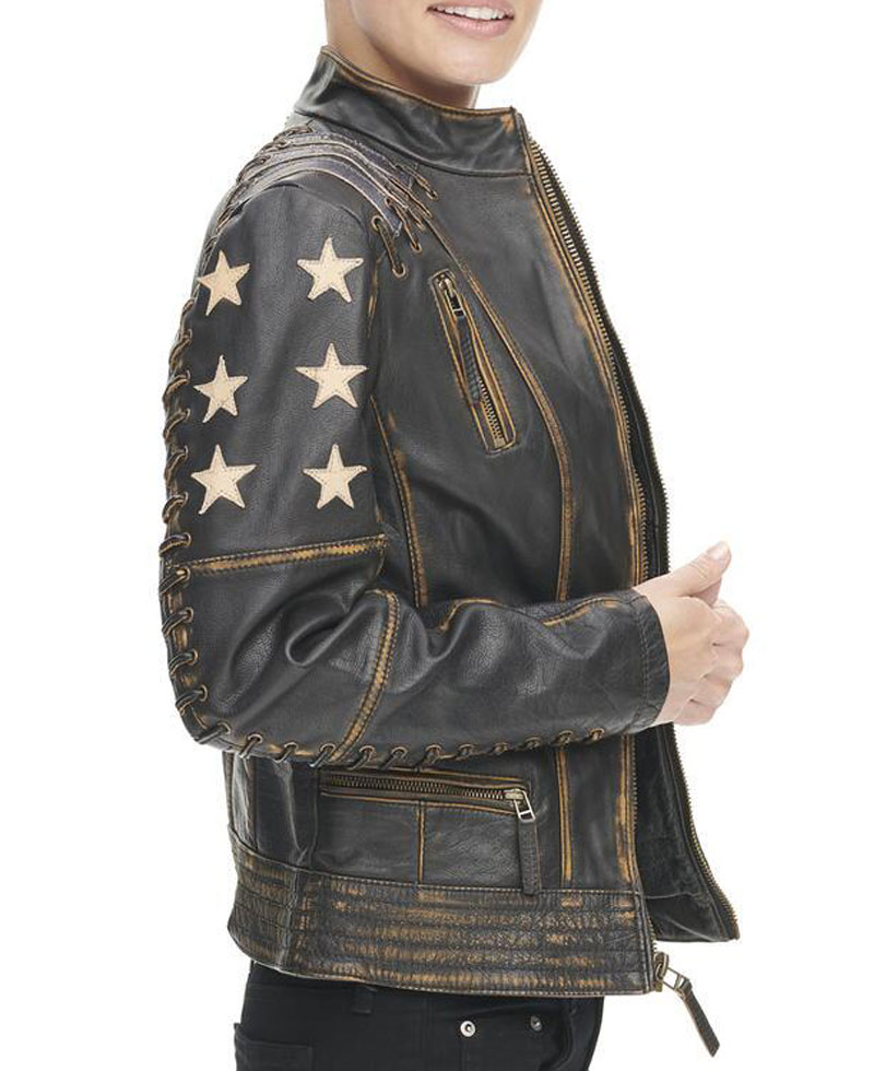 Women’s Biker Stars and Stripes Distressed Black Leather Jacket