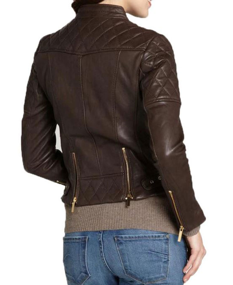 Women’s brown leather biker jacket has diamond quilted style on sleeves, the bottom end and shoulders to make the apparel more attractive and desirable. It comes with internal side stitched with soft and comfortable viscose. The external side of this biker leather jacket is manufactured from premium quality genuine leather material. Also, it has a brown mesmerizing color. The women’s asymmetrical brown leather jacket has front ykk branded asymmetrical zipper closure. It comes with a snap tab style collar. The leather stylish jacket has full length style sleeves on zipper style cuffs. The women’s brown leather biker jacket has zipper pockets on the front chest and waist. It also has a belt around the waistline of this leather biker jacket.