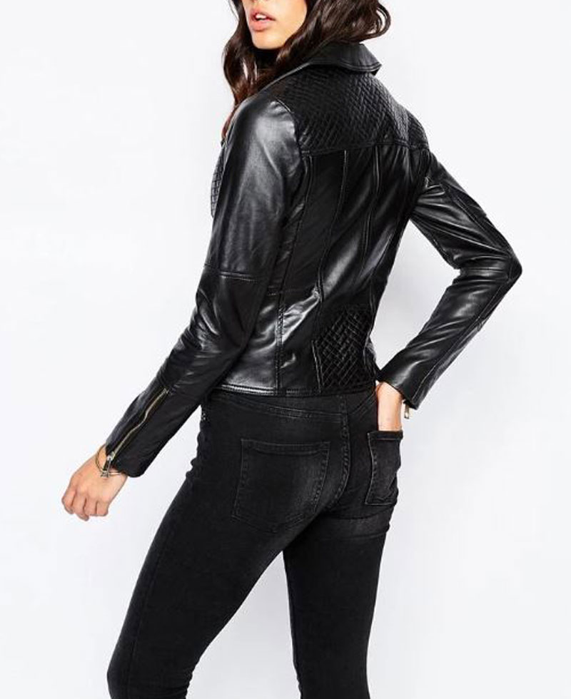 The women’s black biker leather jacket will give you a nice and attractive appearance. It is fabricated from high and rich quality of genuine leather material. On the internal side of this jacket, there is a coating of soft and comfortable viscose lining that will keep you warm and comfortable. It comes in black color. Women’s designer leather jacket comes with full length style sleeves that fits in perfectly on full length style sleeves. The jacket has a diamond quilted pattern to make its appearance more desirable to wear. The women’s designer leather jacket has front zipper pockets where you can secure stuff. The notch lapel collar suits this garb well. The fine quality stitching makes it enduring.